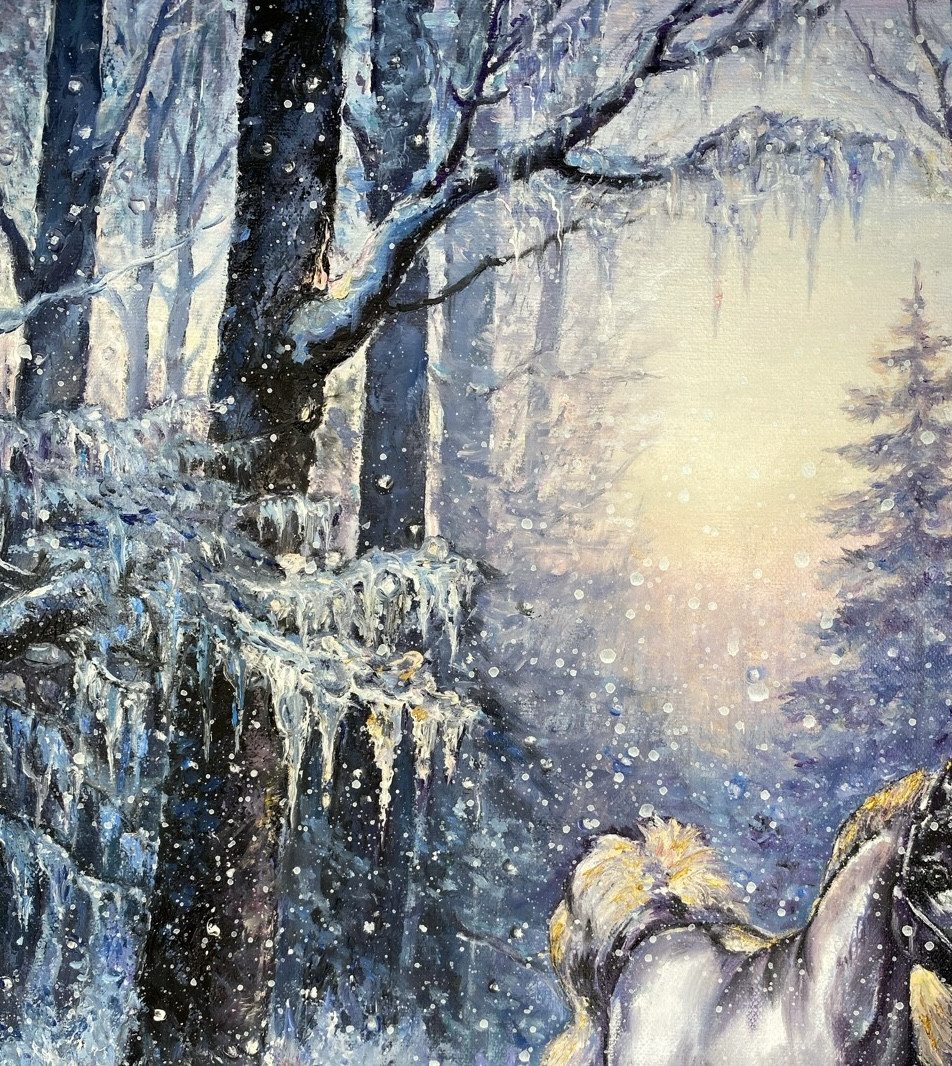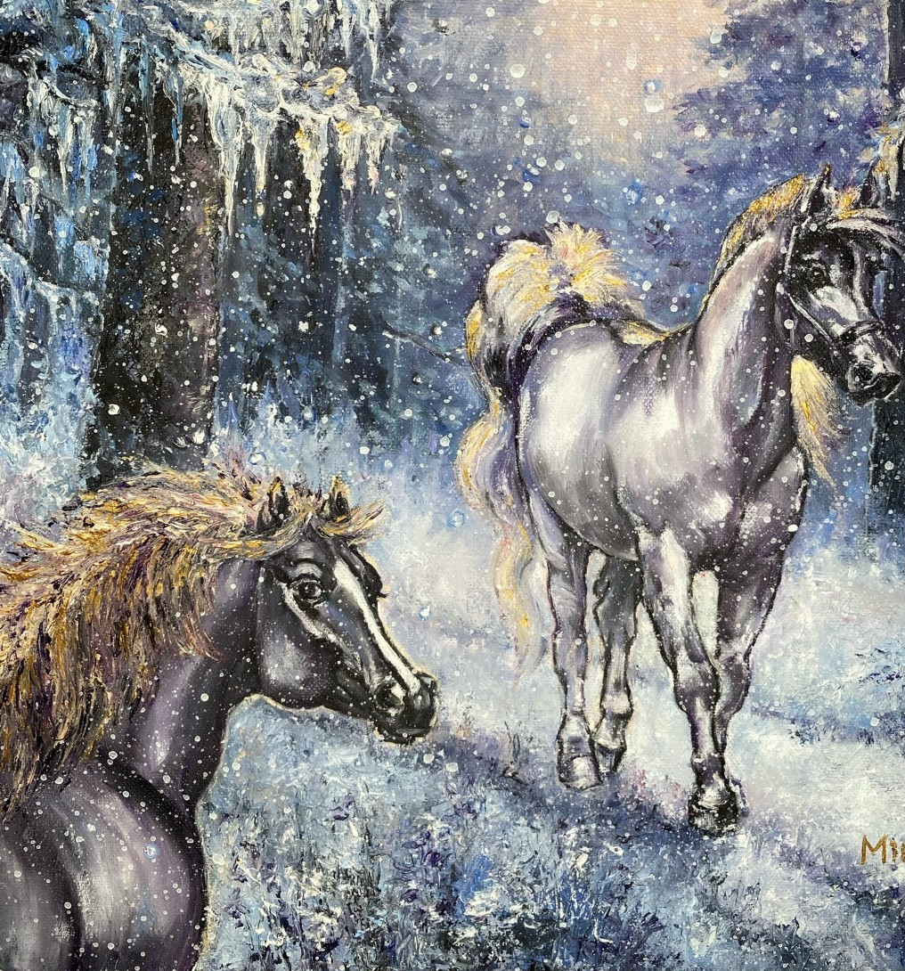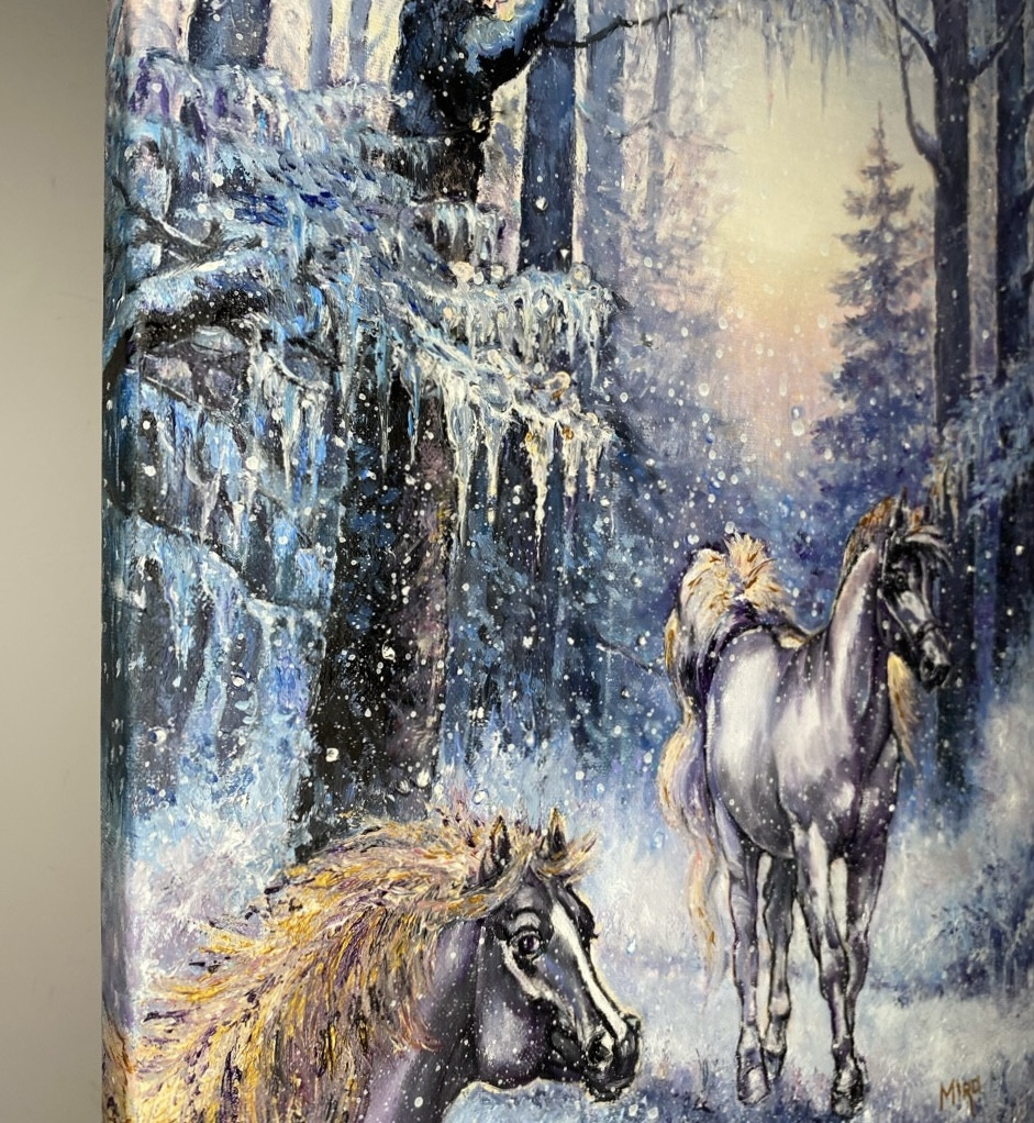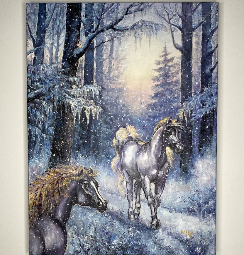 Oryginalny autorski obraz “Para koni o świcie w zimowym lesie” namalowany ręcznie farbami olejnymi na bawełniano-lnianym płótnie o wymiarach 40x30 cm.