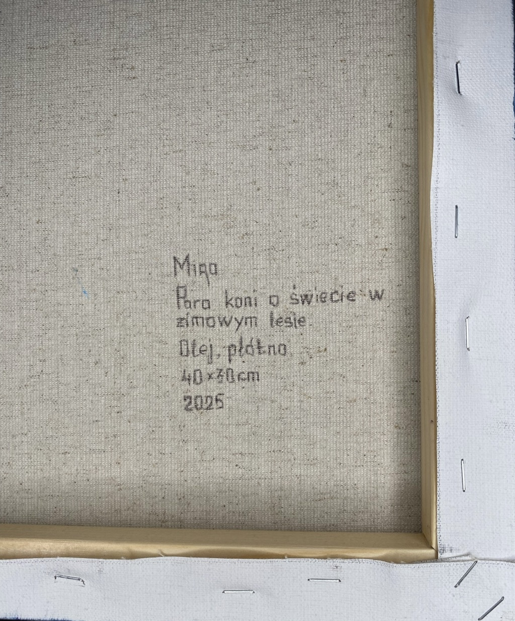 Boki zamalowane w kolorze tła, a z tyłu doczepiona jest zawieszka, zatem można go powiesić bez potrzeby zakupu ramy - obraz gotowy do zawieszenia. Zawerniksowany. Sygnatura autorska znajduje się na awersie i rewersie.