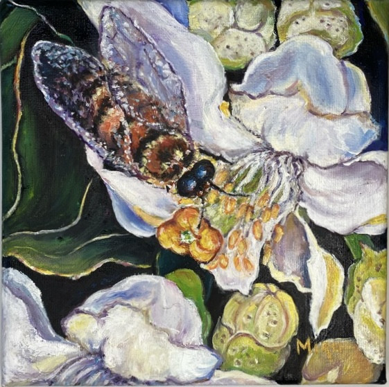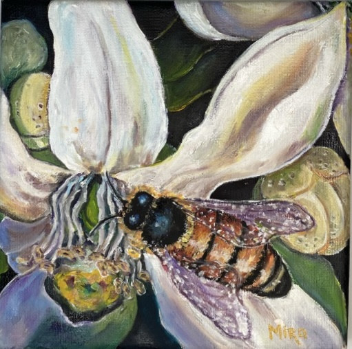 Przedstawiam kompozycję składającą się z trzech niewielkich obrazów (20x20 cm.) o motywie pszczół. Tryptyk ”Pszczoły na białych kwiatach” mojego autorstwa, namalowany profesjonalnymi farbami olejnymi na bawełnianym płótnie. Każdy obraz może żyć własnym życiem lub można je połączyć w oryginalną kompozycją , w której przeplatają się duże białe, bajecznie piękne, egzotyczne kwiaty.