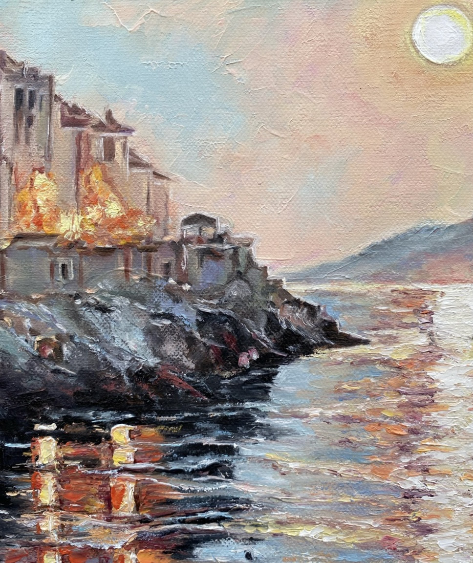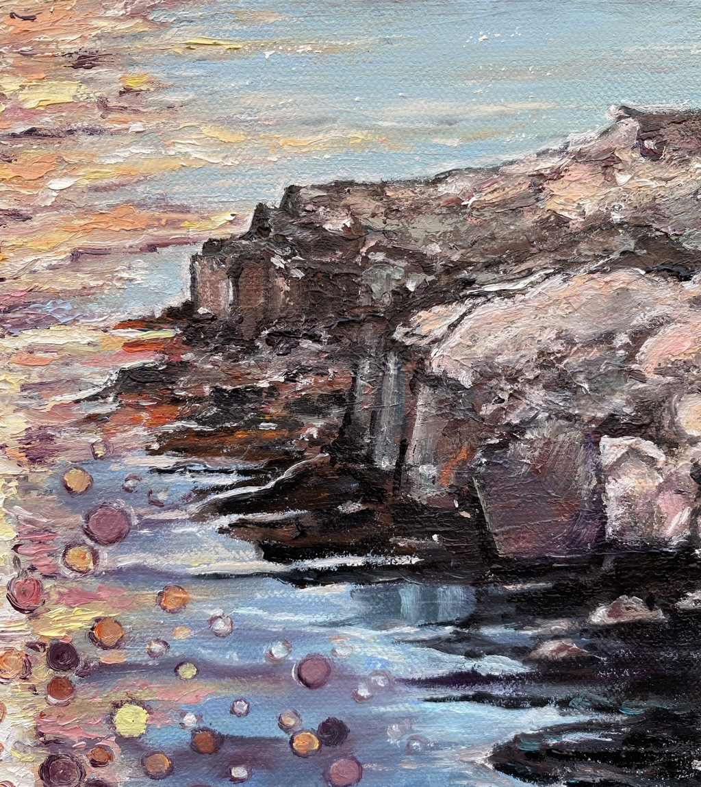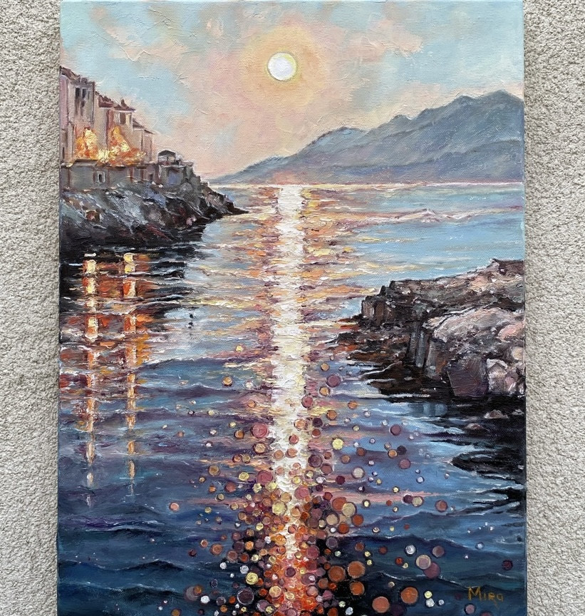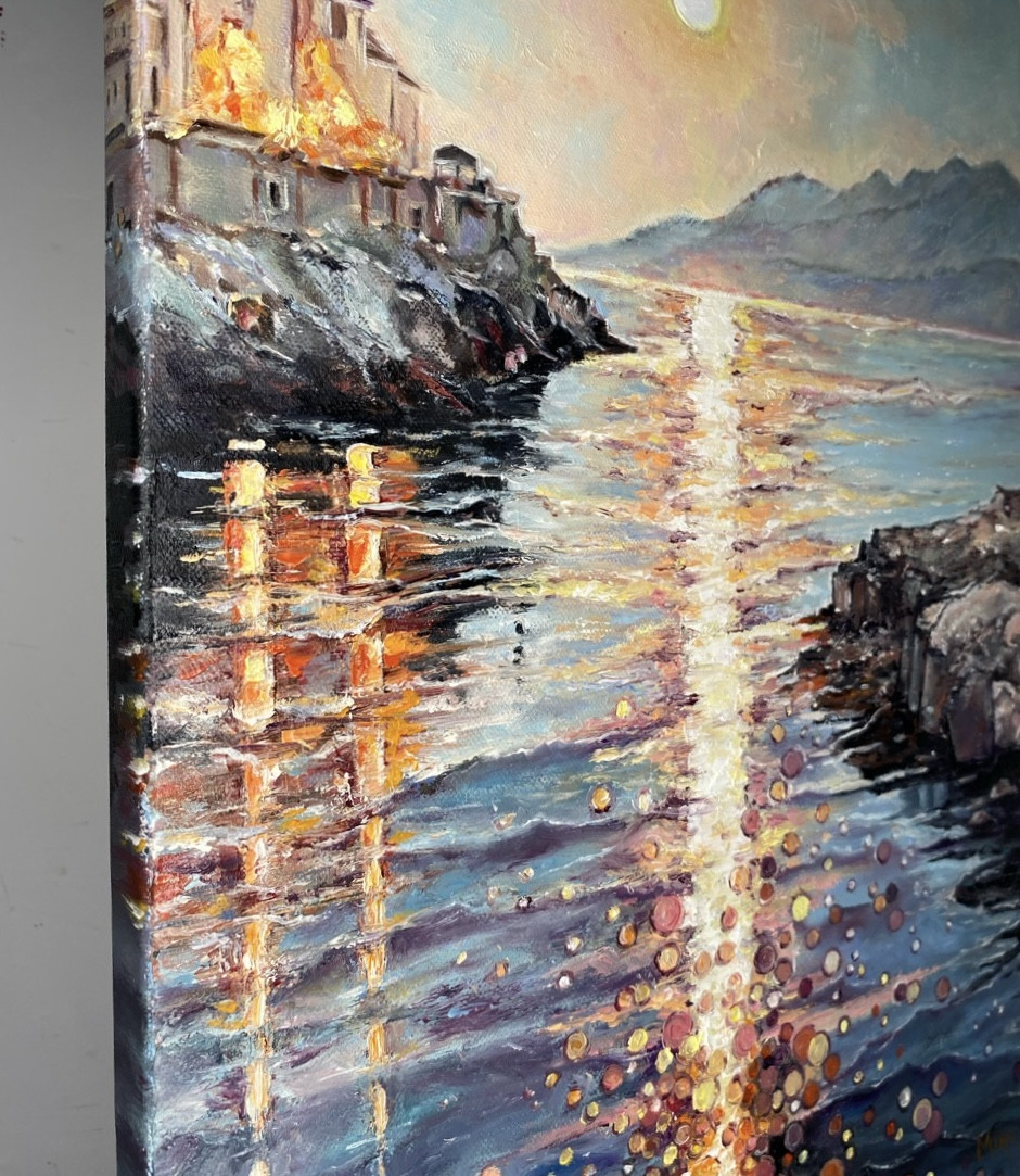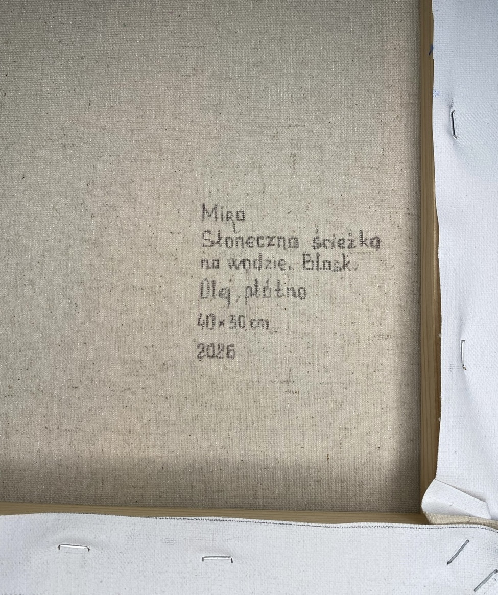 Oryginalny autorski obraz “Słoneczna ścieżka na wodzie. Blask.” namalowany ręcznie farbami olejnymi na bawełniano-lnianym płótnie. Wymiary 40 x 30 cm (szerokość blejtramy: 2 cm). Obraz realistycznie namalowany jest w barwach Ziemi - palecie odcieni występujących w naturze: błękitu, żółci, brązu, bursztynu, fioletu, szmaragdu, czerni i bieli. To jedyne w swoim rodzaju dzieło sztuki. Boki zamalowane w kolorze tła, a z tyłu doczepiona jest zawieszka, zatem można go powiesić bez potrzeby zakupu ramy - obraz gotowy do zawieszenia. Zawerniksowany.