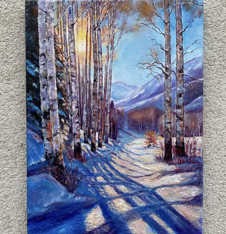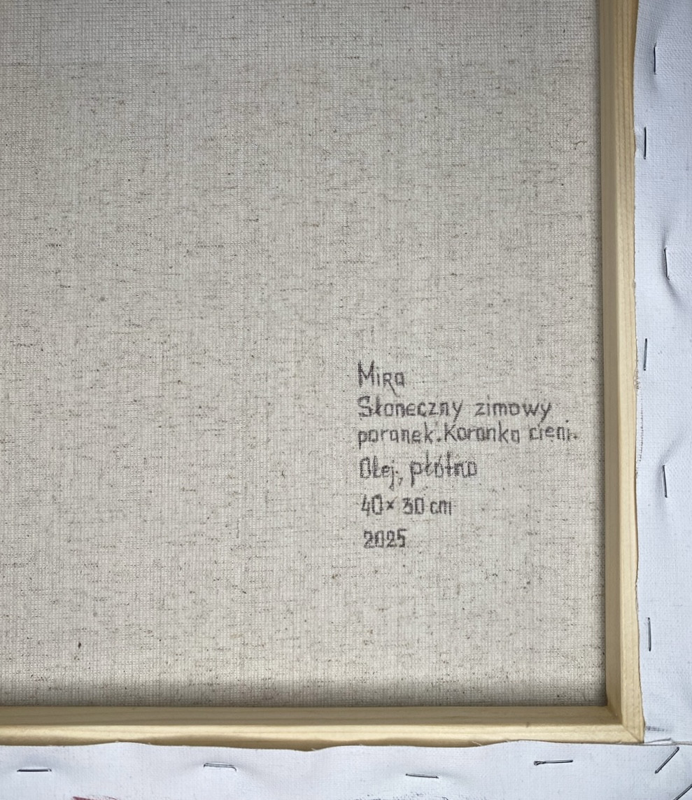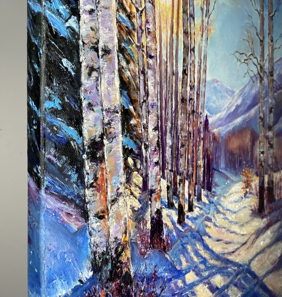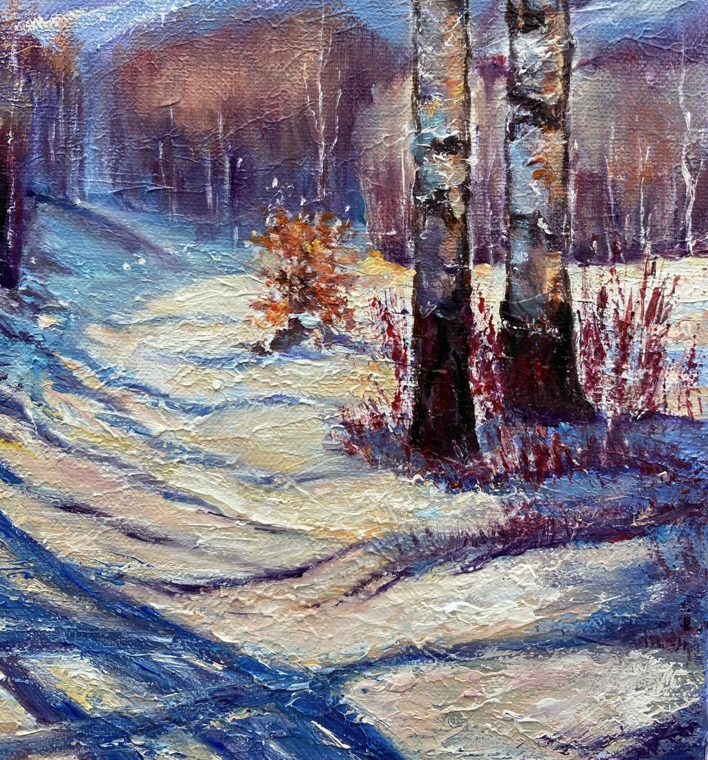 Oryginalny obraz “Słoneczny zimowy poranek. Koronka cieni.” namalowany ręcznie farbami olejnymi na bawełniano-lnianym płótnie o wymiarach 40x30 cm.