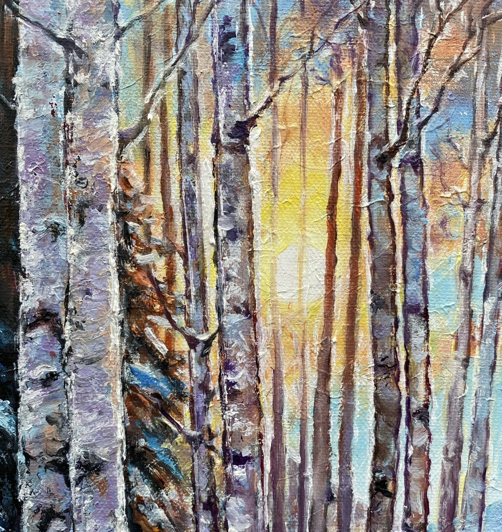 Słoneczny zimowy poranek to wyjątkowe zjawisko, gdy krystalicznie czyste powietrze lśni od mrozu, a nisko położone słońce rzuca długie cienie. To czas, gdy świat zdaje się odradzać, a natura zamierza się w cichym pięknie. Gdy światła i cienia tworzy wykwintną koronką i zainspirowała mnie do namalowania obrazu.