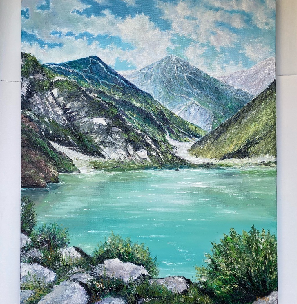 Prezentowany olejny obraz jeziora niezwykle pięknego, szmaragdowego, górskiego, rozmiar 60*50 cm, ręcznie malowany, strukturalny 3D, namalowany abstrakcyjnie w spokojnych, delikatnych, pastelowych kolorach, tworząc wrażenie przejrzystości powietrza i magii letniej przyrody. Kolorowy letni pejzaż pieści oko, koi, inspiruje, leczy. Obraz spokojnej szmaragdowej wody, pięknych gór, krzewów i kwiatów będzie świetnie wyglądał w pomieszczeniach, w których jest dużo dobra, światła i optymizmu. Serdecznie polecam.
