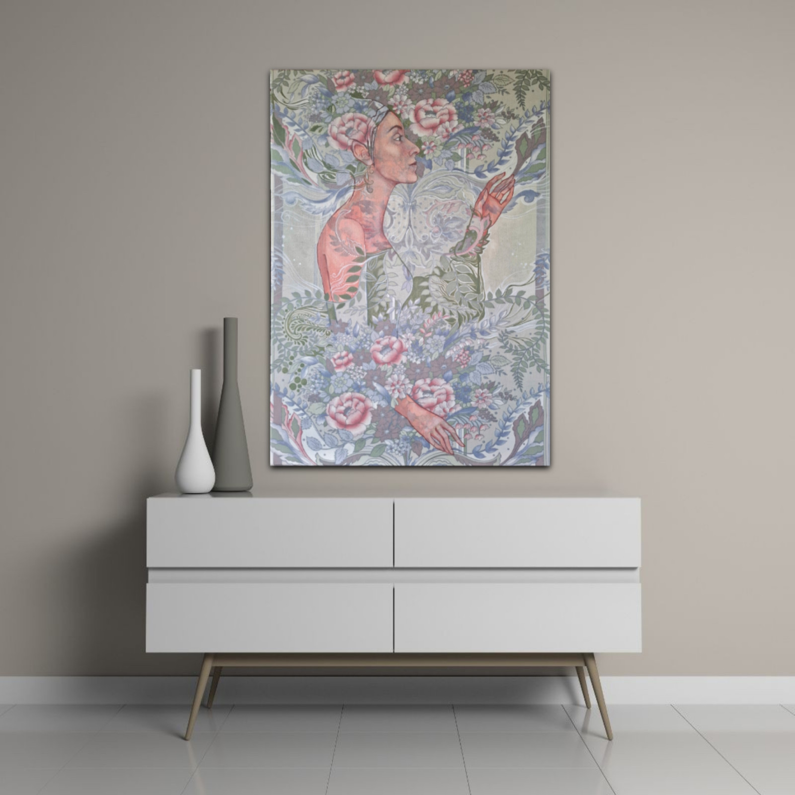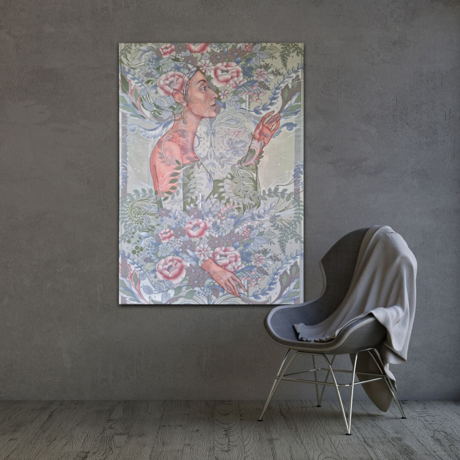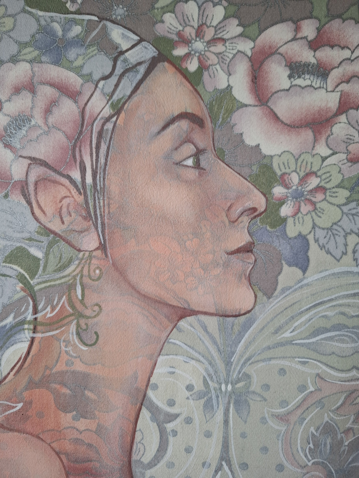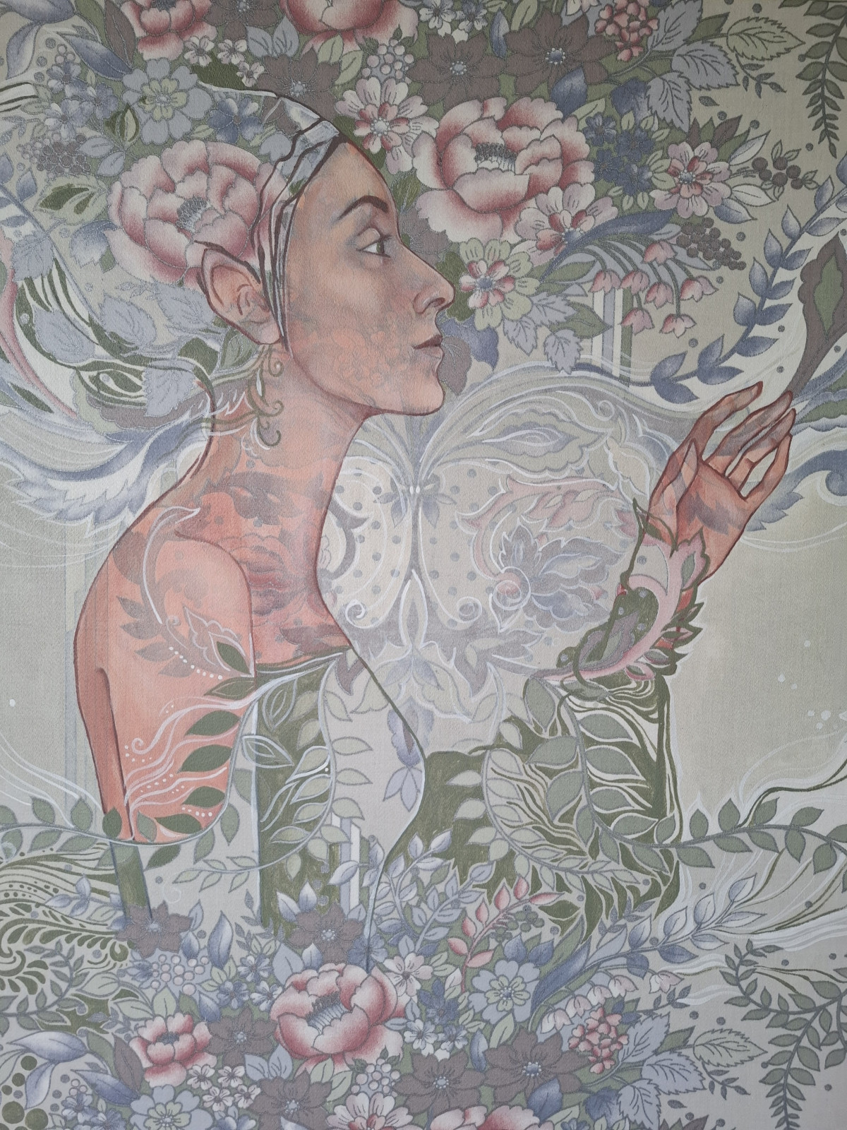 Obraz malowany na dekoracyjnej tkaninie która stanowy ważny element obrazu.