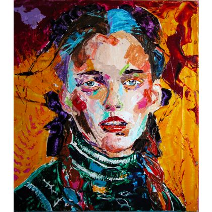 Obraz wykonany farbami akrylowymi na płótnie. Portret zabezpieczony werniksem, sygnowany. Wymiary: 35x40 cm.