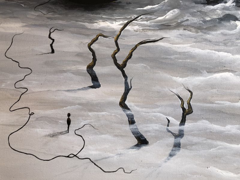 Obraz namalowany farbami akrylowymi. Technika własna.