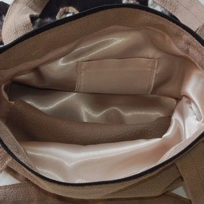 Oryginalna torebka średniej wielkości uszyta z beżowego dekoracyjnego materiału (tył i rączki). Przód z czarnego, drapowanego dżerseju, na którym jest haft z filcowanej włóczki. Zapinana na zamek. W środku atłasowa beżowa podszewka i 2 kieszenie (duża i mała na komórkę). Lekka i miękka. Wys.35cm, szer.35x29cm,rączki 49cm.