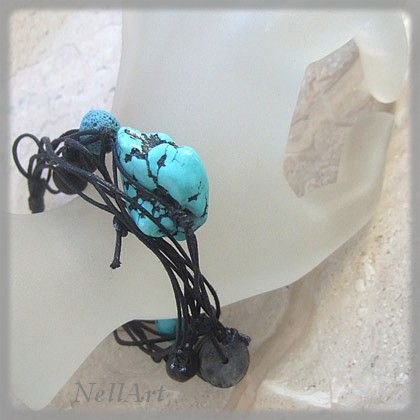Bransoletka z woskowanego sznurka jubilerskiego i naturalnych kamieni howlitu,korala czarnego,muszli szarej,lawy wulkanicznej.