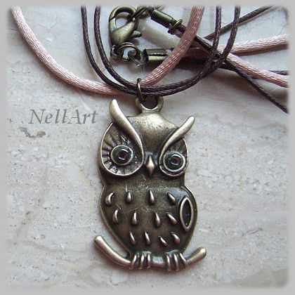 Naszyjnik ze sznurka atłasowego i naturalnego woskowanego z sową w kolorze starego złota o zielonych szklanych oczach.
