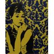 Obraz akrylowy na plotnie. Wymiary 24x30 cm. Styl Pop-Art. Trojkolorowy - ultramaryna, zolty oraz czarny. Obraz przedstawiajacy Audrey Hepburn z cygaretka. Oprawiony w czerwona rame.