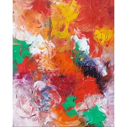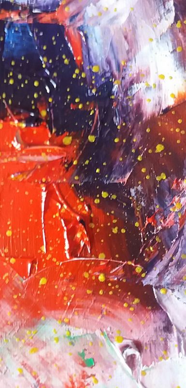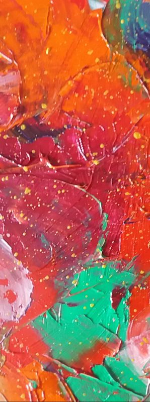 roku. Moje abstrakcje są unikatowe jedyne bez możliwości powtórzenia. Nasycenie koloru jakie występuje w pewnych miejscach są czasami trudne do uchwycenia na zdjęciu, by zobaczyć bogactwo kolorystyczne i to co się na nim dzieje należy spotkać się z nim na żywo, a widok jest wciągający. Kolory mogą się nieznacznie różnić w zależności od ustawień monitora. Wysyłam obraz jako bezpieczną paczkę solidnie zabezpieczoną w twardym opakowaniu.