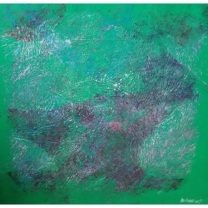 Wymiary 50/50cm, obraz olejny wykonany na płótnie, boki surowe, sygnowany z przodu w dolnym prawym rogu oraz z tyłu na płótnie . Obraz zabezpieczony werniksem. Powstał w 2016roku. Moje abstrakcje są unikatowe i jedyne bez możliwości powtórzenia. Nasycenie koloru jakie występuje w pewnych miejscach są czasami trudne do uchwycenia na zdjęciu, by zobaczyć bogactwo kolorystyczne i to co się na nim dzieje należy spotkać się z nim na żywo, a widok jest wciągający. Obraz świetnie komponuje się z surowymi bokami dlatego zostały celowo nie zamalowane, gdzie moją specjalnością jest zamalowanie w każdym obrazie. Kolory mogą się nieznacznie różnić w zależności od ustawień monitora. Wysyłam obraz jako bezpieczną paczkę solidnie zabezpieczoną w twardym opakowaniu.