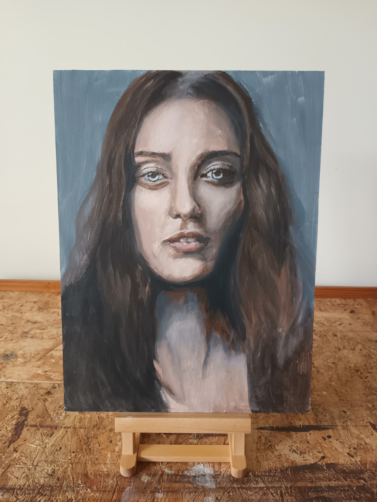 Portret kobiety wykonany techniką akrylową na płycie HDF pokrytej płótnem.