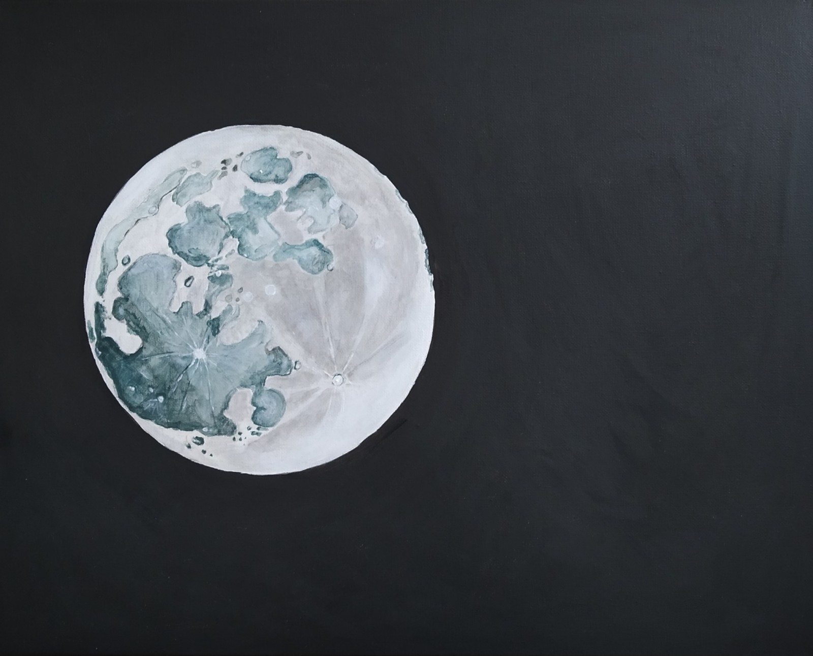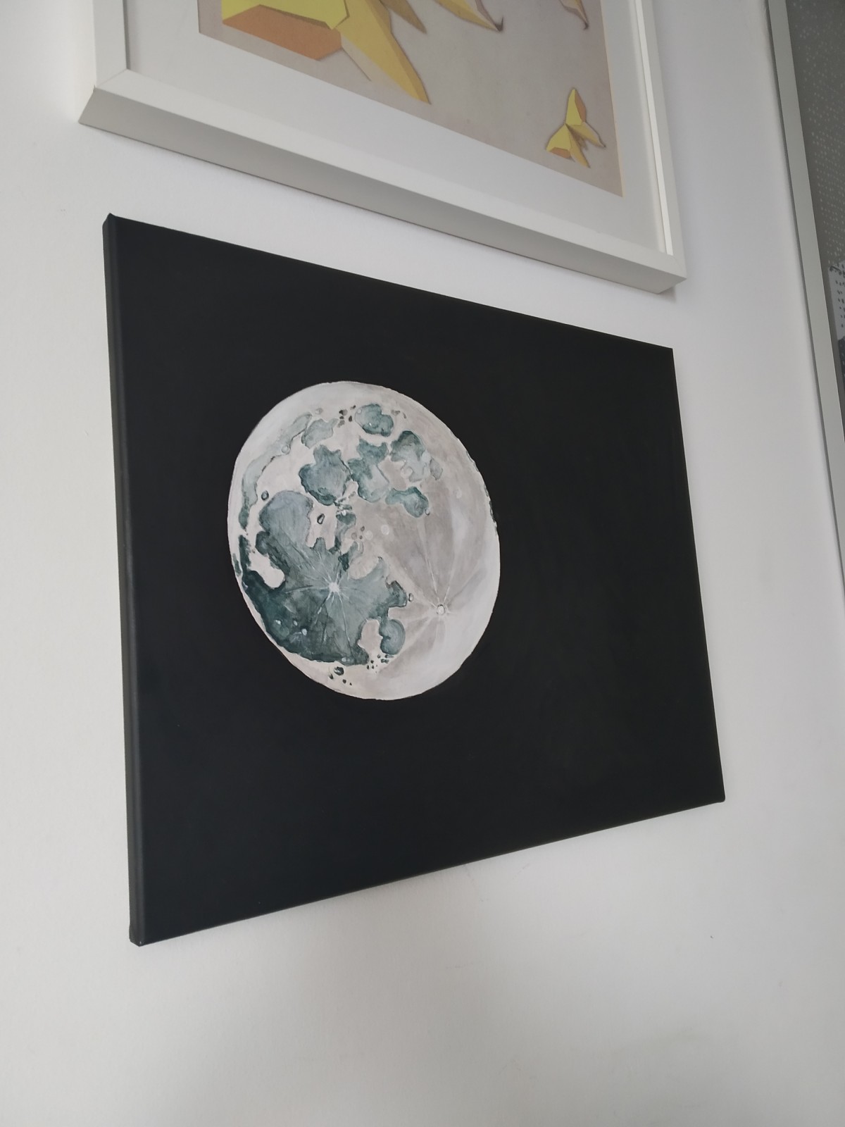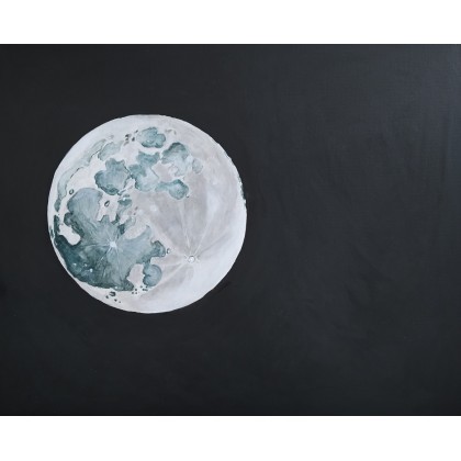 Księżyc (mun) w czarnej przestrzeni. Monochromatyczna kompozycja, nieco odbiegająca od dotychczasowej ścieżki jaką obrałam ostatnio w malowaniu obrazów.