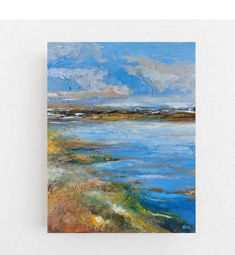 Praca Pejzaż to obraz namalowany farbami akrylowymi na podobraziu o wielkości 50/40 cm.