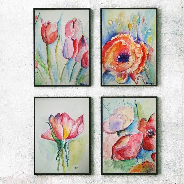Prace wykonane farbami akwarelowymi na papierze akwarelowym , format każdej 18/24 cm. Przedstawione są w przykładowych ramach (sprzedaje jako komplet). Zapraszam :)