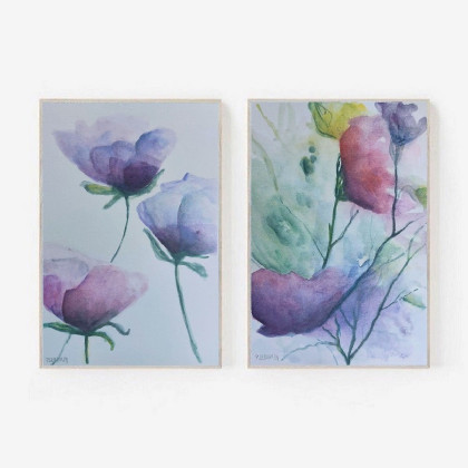 Dwie oryginalne akwarele, wykonane profesjonalnymi farbami akwarelowymi Rembrandt na papierze akwarelowym 300 g/m2 . Prace są sygnowane, przedstawione w przykładowych ramach. Wymiary prac : A5 x 2 . Kolory mogą się nieznacznie różnić od oryginału, co jest uzależnione od ustawień monitora. Zapraszam:)