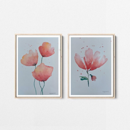 Dwie prace wykonane farbą akwarelową na papierze akwarelowym 300g/m2, format każdej A5. Przedstawione są w przykładowych ramach. Zapraszam :)