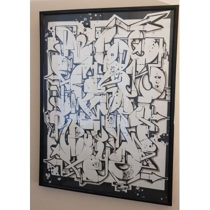 rysunek na papierze(gruby - gramatura nieznana), alfabet w stylu graffiti, ołowek+tusz, wymiary z ramką, która jest w zestawie31x41