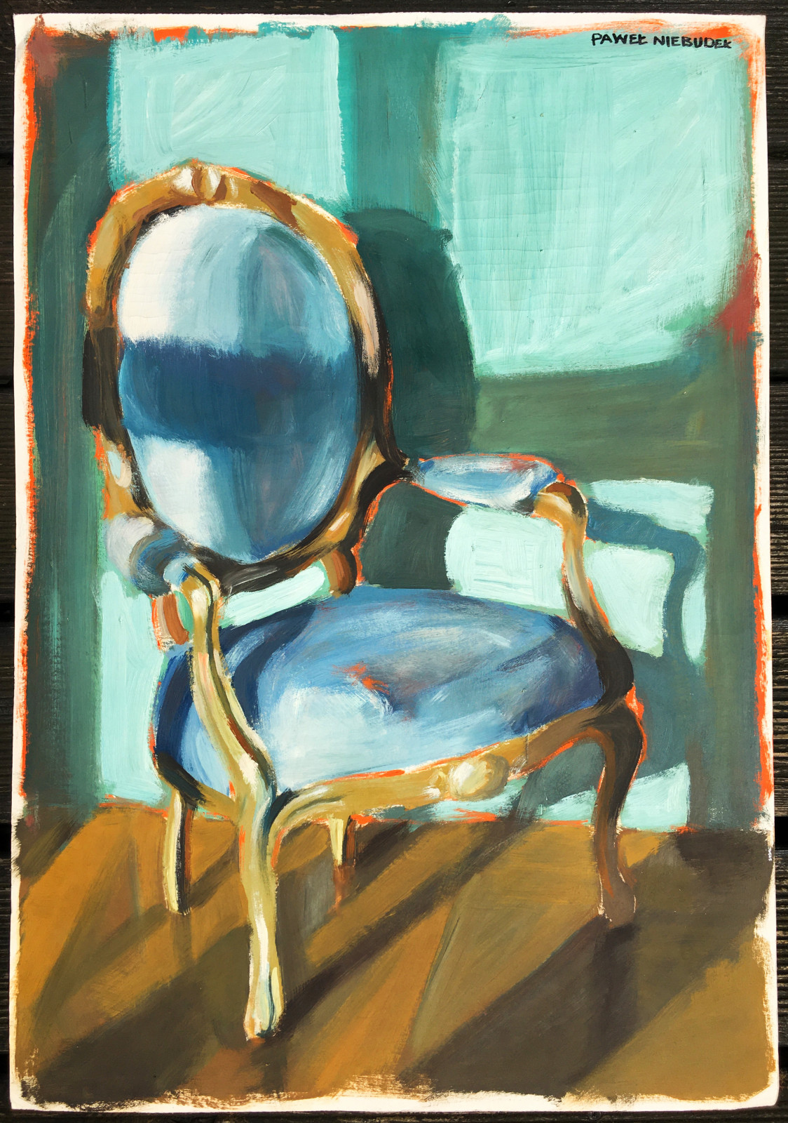 Obraz w technice akrylowej na kartonie. Martwa natura z fotelem.