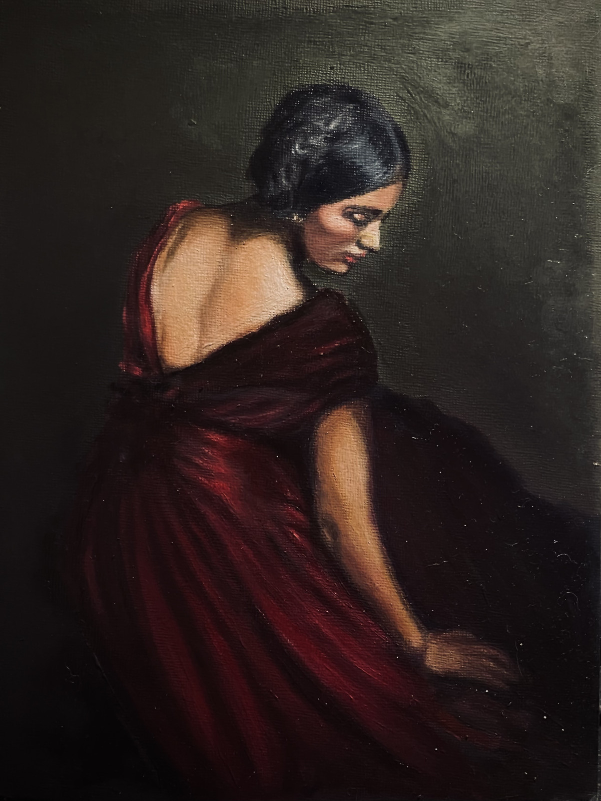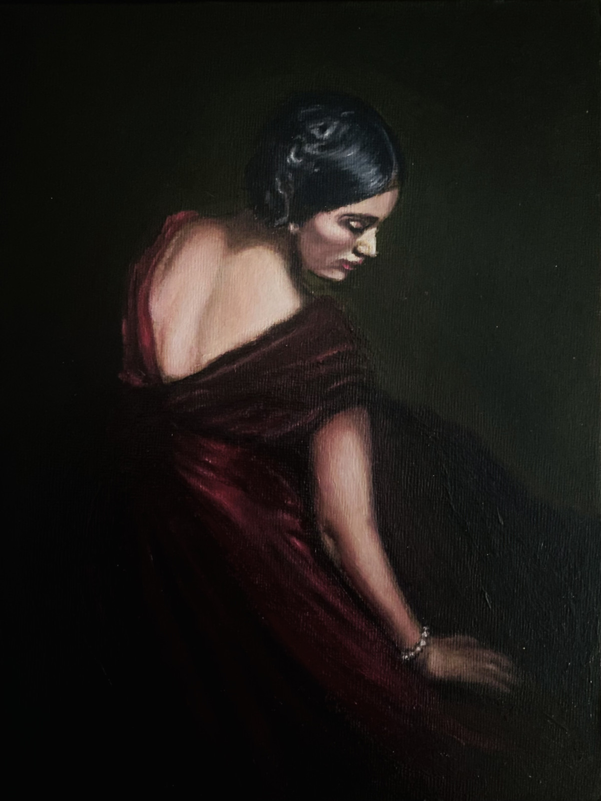 Portret kobiety w czerwonej sukni. Olej na kartonie. Rozmiar kartonu A4.