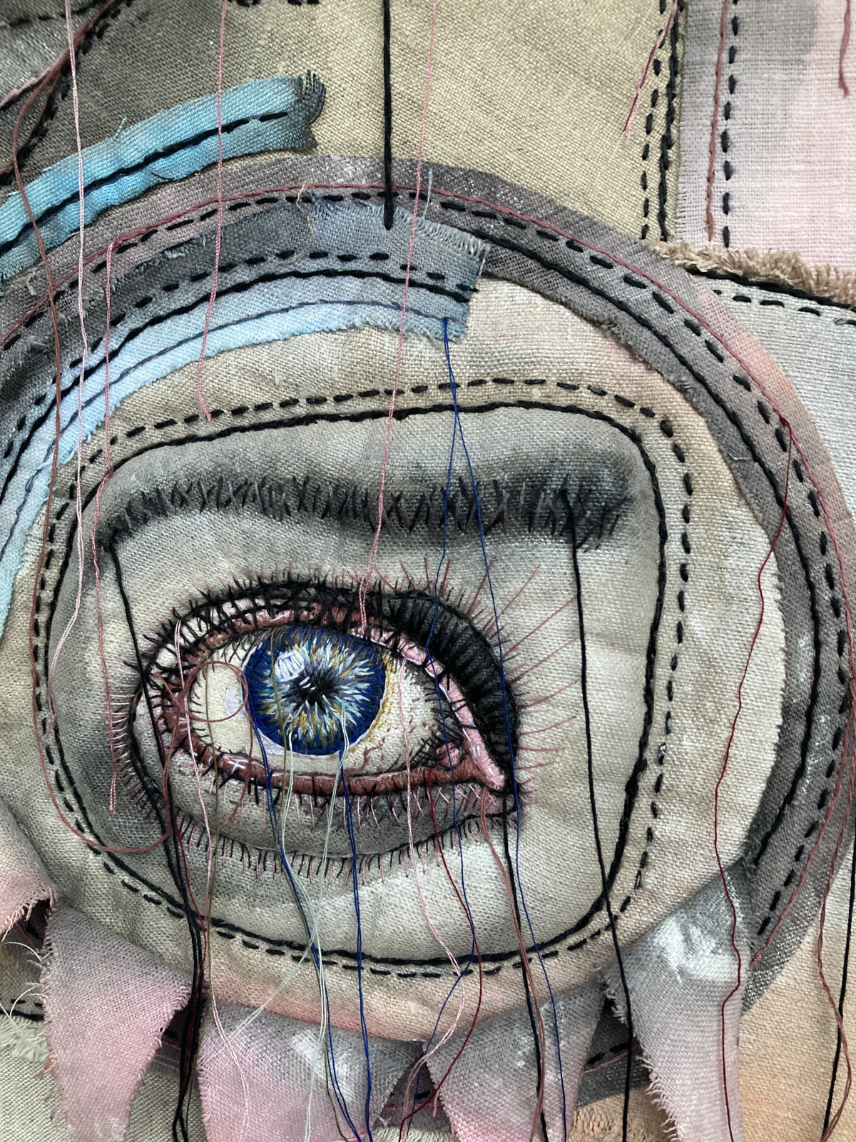 Nietuzinkową makatę na ścianę uszyłam z tkanin lnianych, pomalowałam farbami i ręcznie wyhaftowałam.
