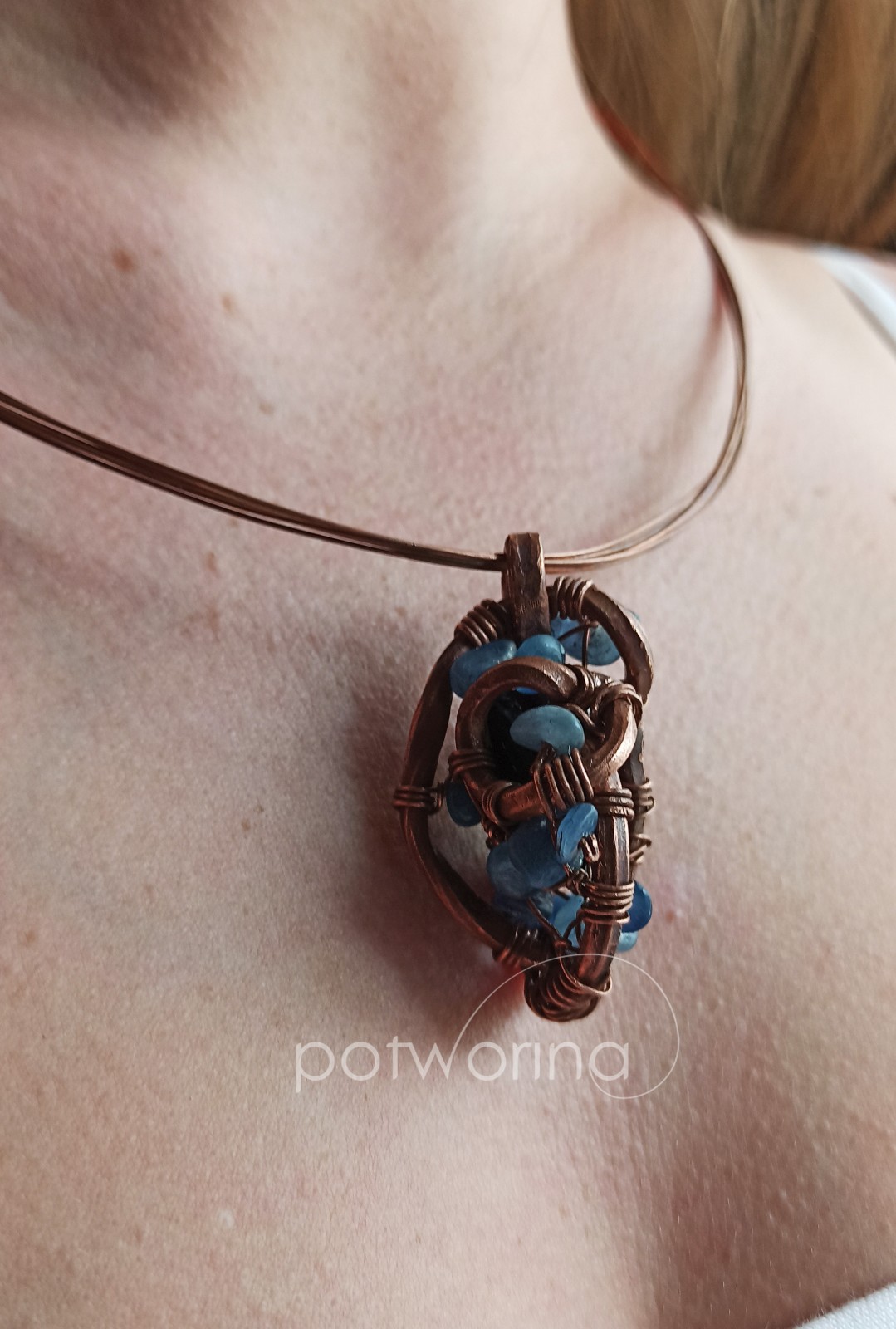 Naszyjnik z kianitu i czarnego turmalinu połączony z kilkoma miedzianymi drutami. Może być noszony na dwie strony. Każda strona jest inna. Mniejsze minerały kyanitu zostały zakomponowane wokół większego kawałka turmalinu i owinięte różnej wielkości miedzianym drutem. Naszyjnik ze względu na swój skład jest połączeniem dwóch minerałów. Czarny turmalin jest talizmanem przyciągającym przyjaźnie, bogactwo i miłość. Ułatwia komunikację, poprawia cierpliwość, pomaga w minimalizowaniu niepokoju, stresu i zdrowego snu. Kyanit pomaga w rozwoju duchowym, medytacji, pomaga się skoncentrować i zrelaksować. Stymuluje intuicję, widzenie pozazmysłowe i zdolności parapsychiczne. Równoważy wszystkie czakry, oczyszcza meridiany i regeneruje aurę.