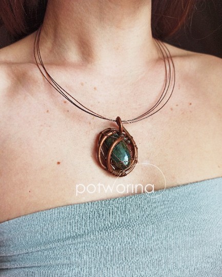 Zawieszka o wymiarach 3,5x5cm, kaboszon labradoryt wraz z drobnymi kamieniami tego samego minerału. Trzy miedziane obręcze obwód 47 cm, zapięcie i dodatkowe elementy wykonane z miedzi.