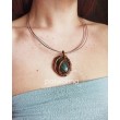 Naszyjnik z kaboszonem labradorytu na trzech miedzianych obręczach. Labradoryt przynosi jasność myśli jednocześnie otwierając na mądrość Wszechświata. Uważany jest za kamień przynoszący ulgę przy stanach niepokoju, beznadziei i depresji, zastępując je entuzjazmem, wiarą w siebie i inspiracją.