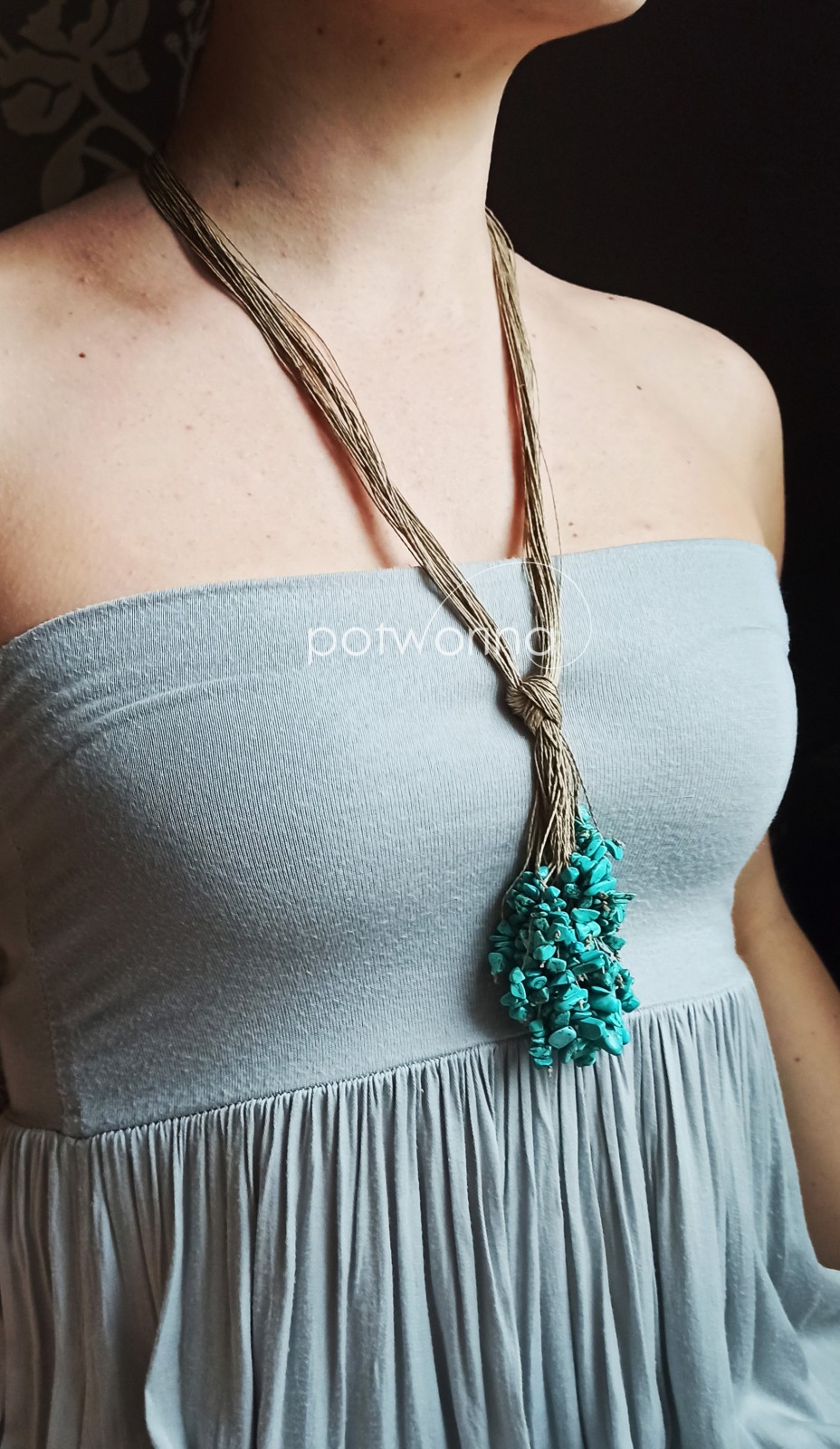 Ręcznie robiony naszyjnik z lnianego sznura i naturalnego turkusu i howlitu. Turkus jest symbolem hojności, szczerości i oddania. Inspiruje do bycia szczerym z samym sobą i pomaga zdefiniować czego od życia naprawdę pragniemy. Stymuluje kreatywność i pobudza wyobraźnię. Howlit z kolei reprezentuje duchowe cechy spokoju, czułości i otwartości. Może nam przynieść spokój i jasność umysłu.