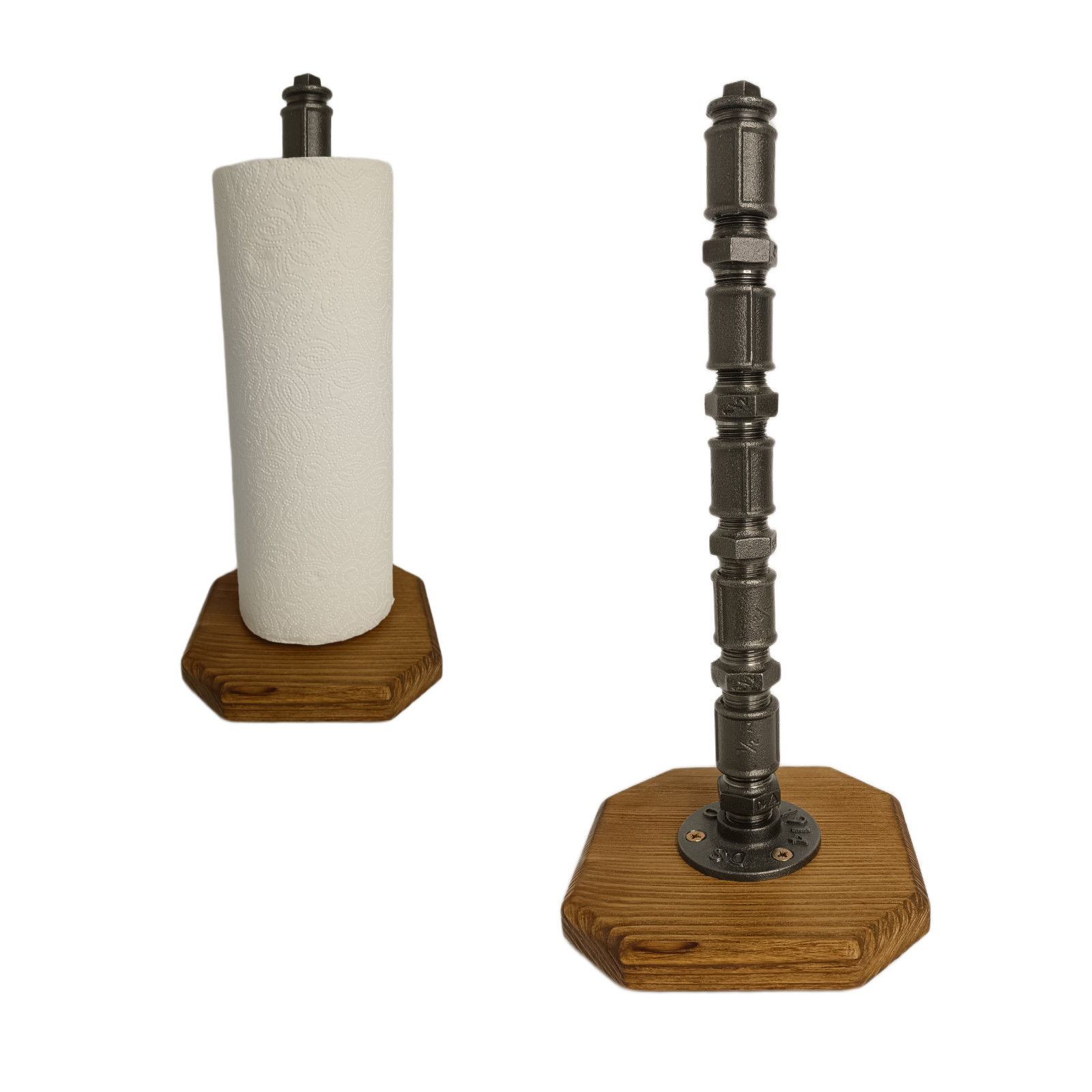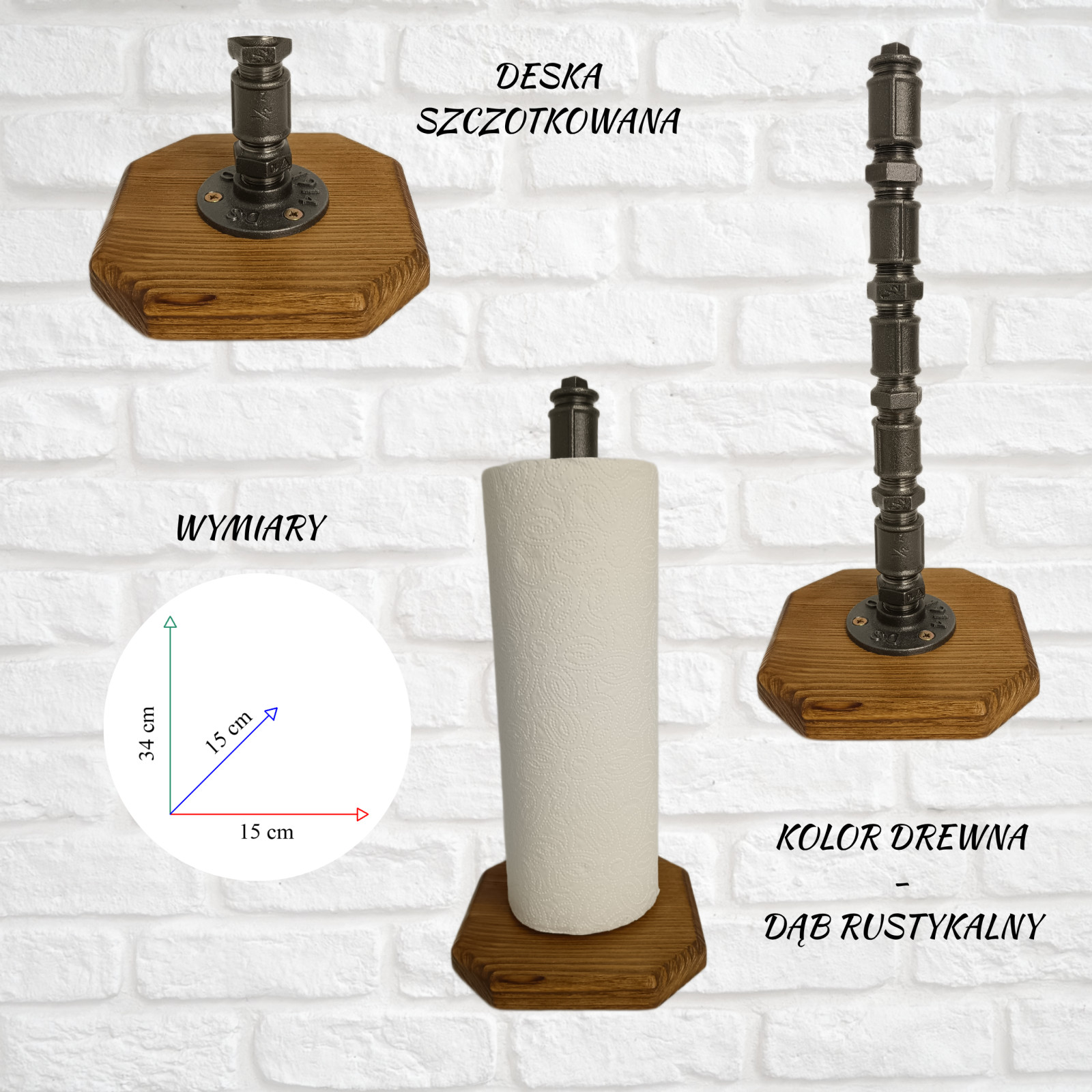 - Przedstawiamy ręcznie wykonany stojak na papier kuchenny w stylu loftowym – połączenie postarzanego, szczotkowanego drewna oraz metalowej armatury, która nadaje mu industrialny charakter.