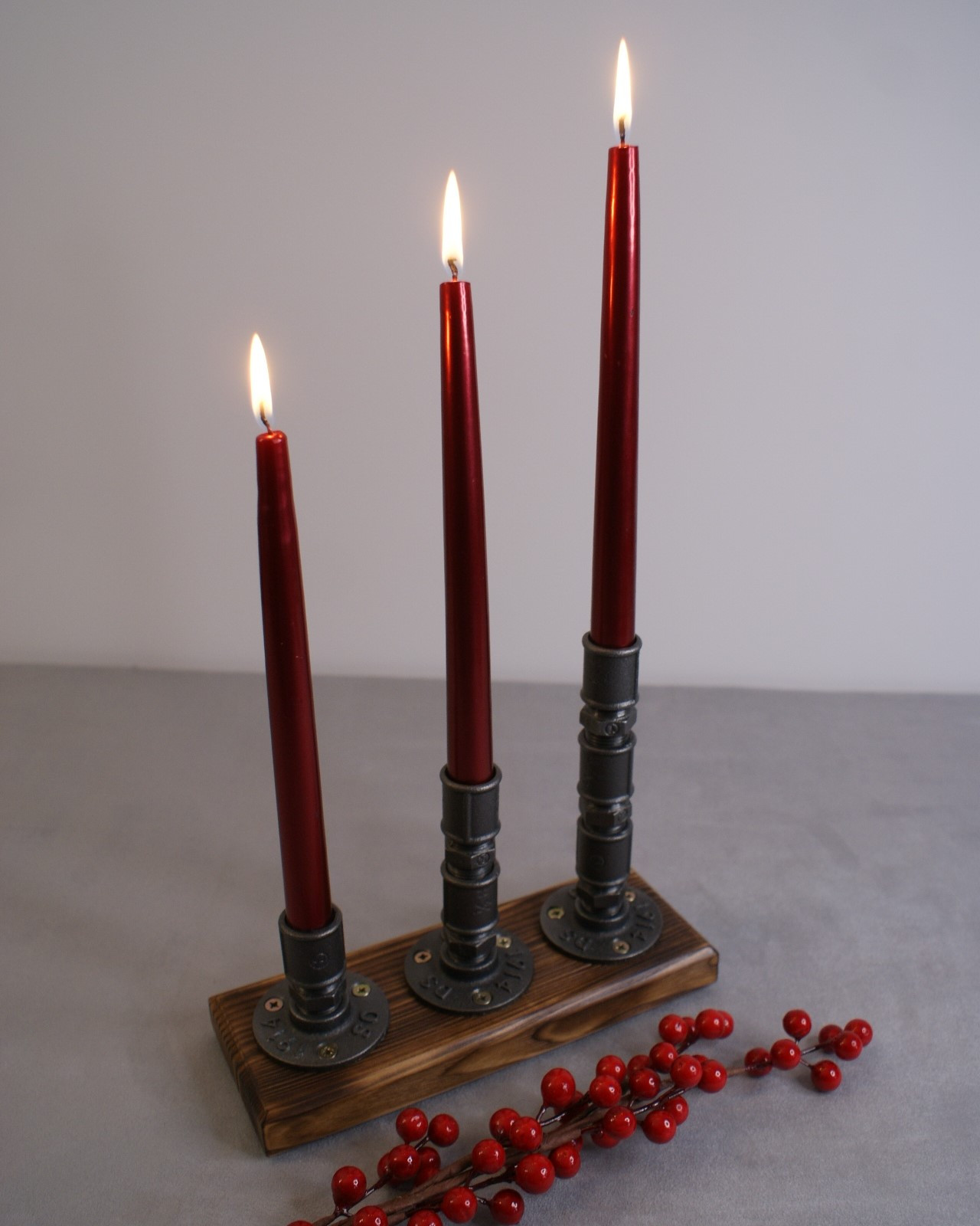 Przedstawiamy ręcznie wykonany świecznik w połączeniu dwóch stylów: industrialnego z uwagi na wykorzystanie stalowych rur hydraulicznych oraz stylu loftowego dzięki ciepłu jakie daje nam postarzałe lakierowane drewno.