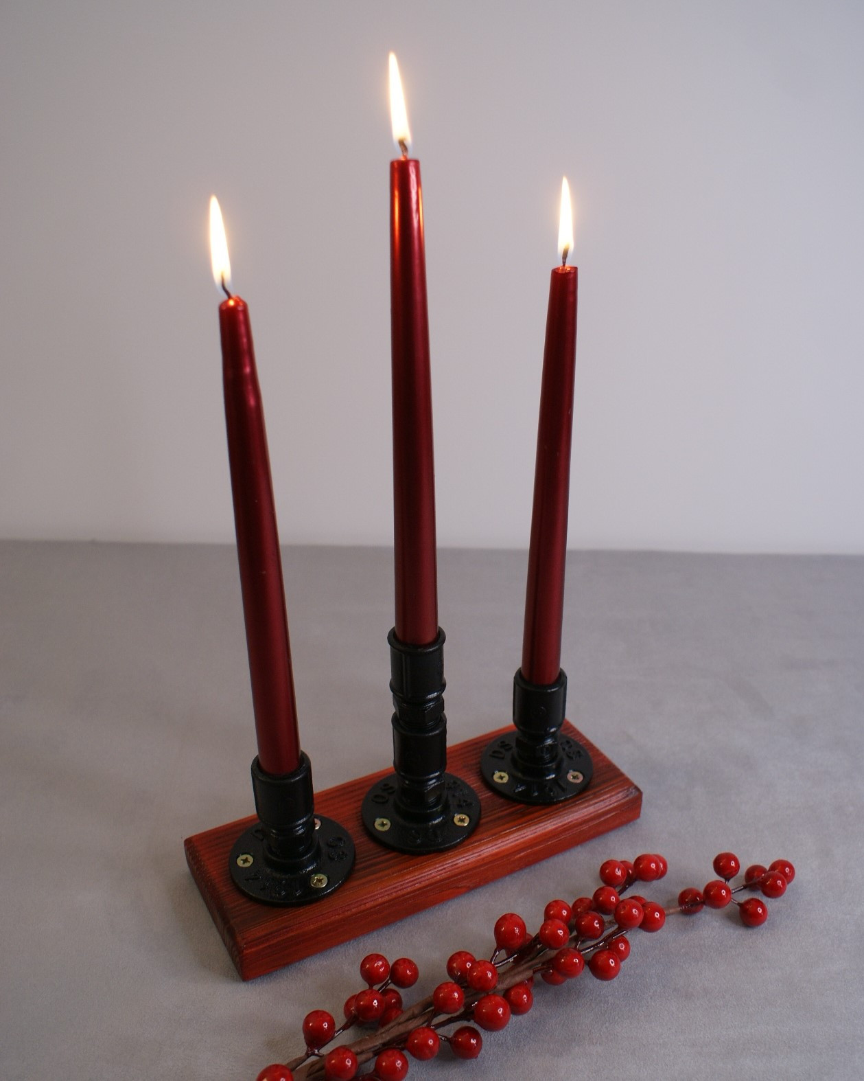 Przedstawiamy ręcznie wykonany świecznik w połączeniu dwóch stylów: industrialnego z uwagi na wykorzystanie stalowych rur hydraulicznych oraz stylu loftowego dzięki ciepłu jakie daje nam postarzałe lakierowane drewno.