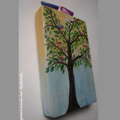Na starej grubej desce zostało namalowane drzewo z kolorowymi ptaszkami, boki deski są zamalowane u szczytu deski zostały przytwierdzone dwa wyrzeźbione kolorowe ptaszki.Obrazek nieco eko, folk, bardzo radosny i prosty świetnie będzie prezentował się we wnętrzach rustykalnych jak i nowoczesnych, w pokoju dziecięcym, kuchni. Obrazek do powieszenia z tyłu posiada zawieszkę z drutu. Wymiary deski: długość deski 23,5cm x szerokość ok 16 cm, ptaszek większy: 3 cm x szer.6,5 cm.