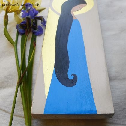 Anioł malowany akrylami, na uprzednio zagruntowanej, desce zwieńczonej wyrzeźbionymi ptaszkami. Deska do powieszenia na ścianie (z tyłu zawieszka). Anioł i ptaszki utrzymane w odcieniach niebieskich.Wymiary: dł. wraz ptaszkiem szczytowym 45cm x szer. 13,5 cm wraz z ptaszkami 15 cm w przypadku sprzedaży i ponownego zamówienia czas realizacji ok 7-10 dni