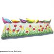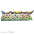 Na desce została namalowana kolorowa łąka, do szczytu deski zostały przytwierdzone ptaszki, które własnoręcznie wyrzeźbiłam i pomalowałam:) jest ich siedem, wesoło ćwierkają na łące i czekają na dom w którym zamieszkają....