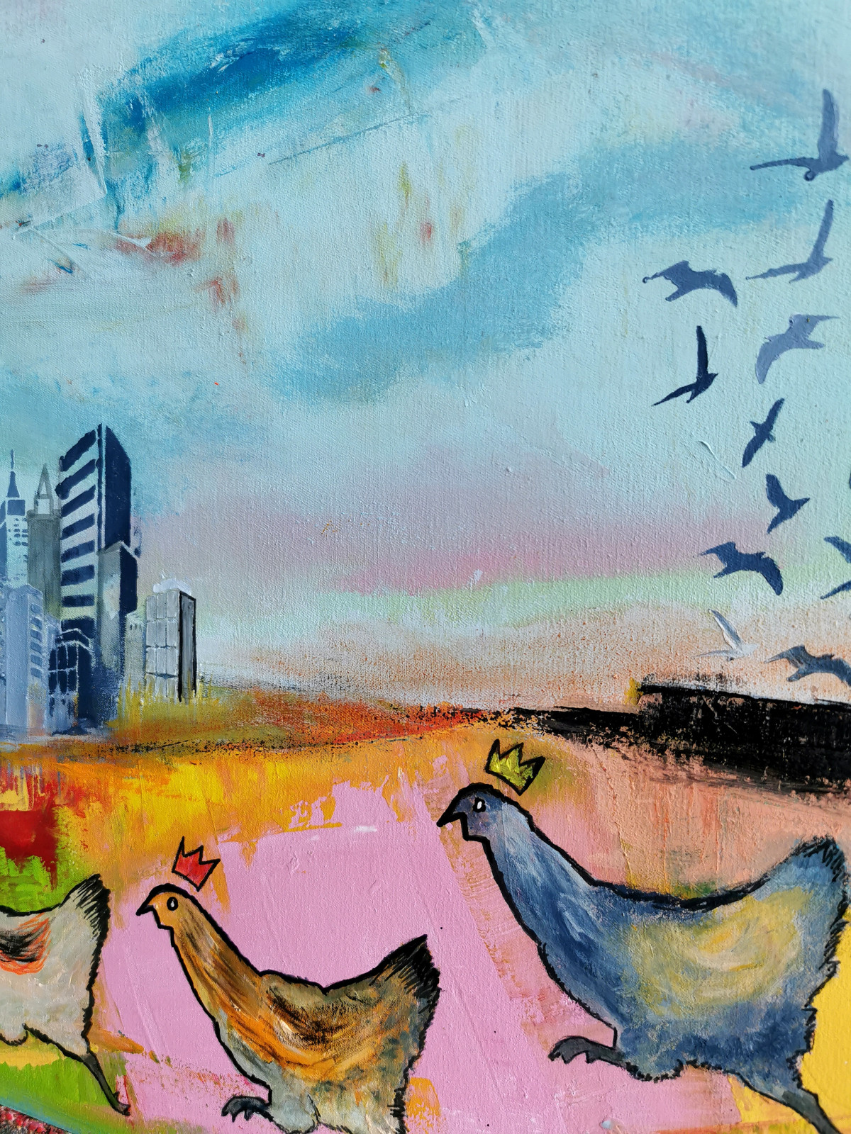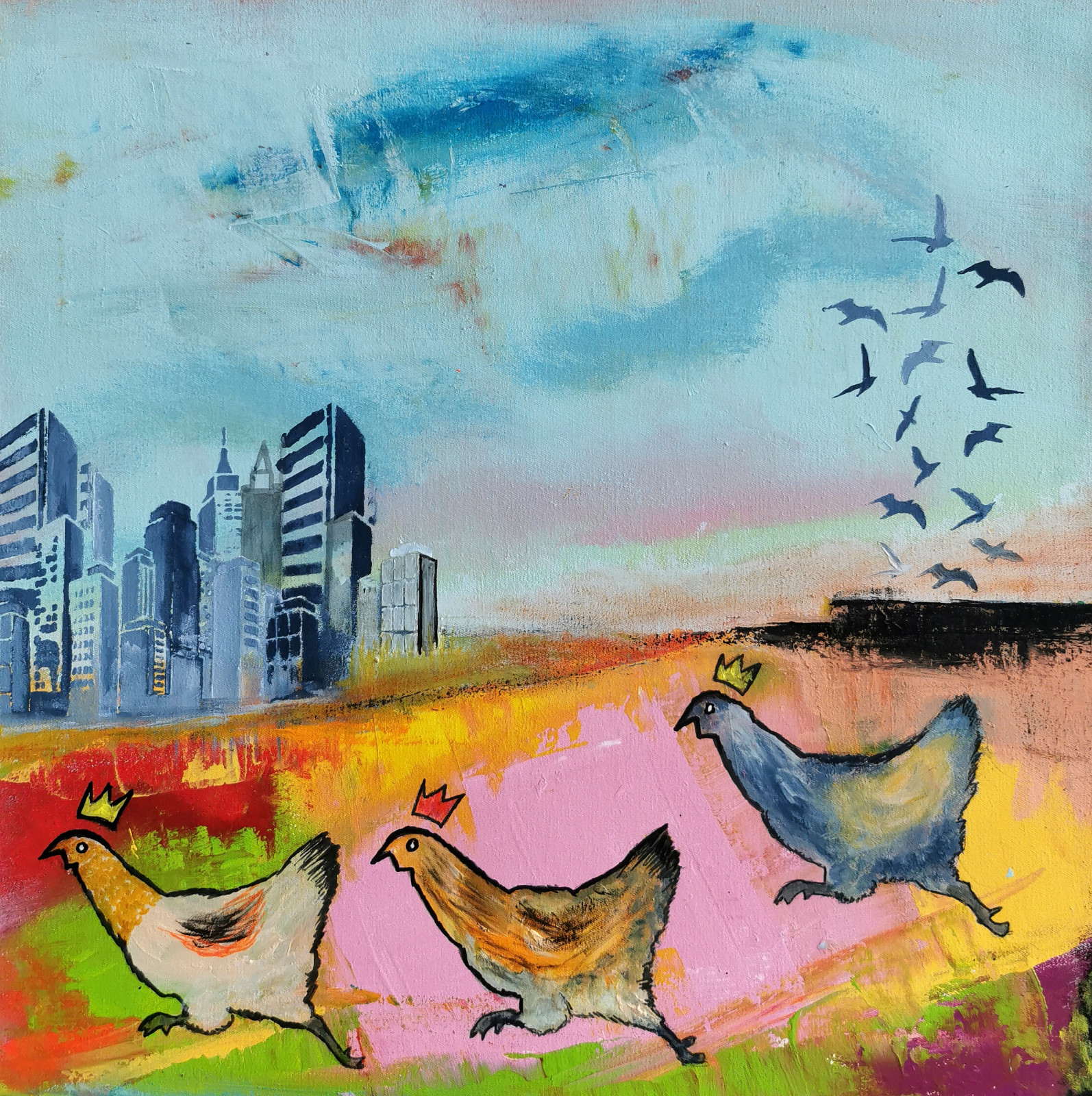 Obraz o wymiarach 50 x 50 cm Atmosfera obrazu jest lekka i pełna nadziei, co potęguje jasne, błękitne niebo z delikatnymi, różowymi akcentami o wschodzie lub zachodzie słońca. Stado ptaków odlatujących w górę, w prawym górnym rogu, symbolizuje wolność, ucieczkę i dążenie do nowych celów. Kontrast między prostotą kur a złożonością miejskiego krajobrazu skłania do refleksji nad tym, co w życiu jest najważniejsze – czy to powrót do natury, czy dążenie do miejskiego zgiełku i możliwości. To dzieło emanuje pozytywną energią i zachęca do podążania własną ścieżką.