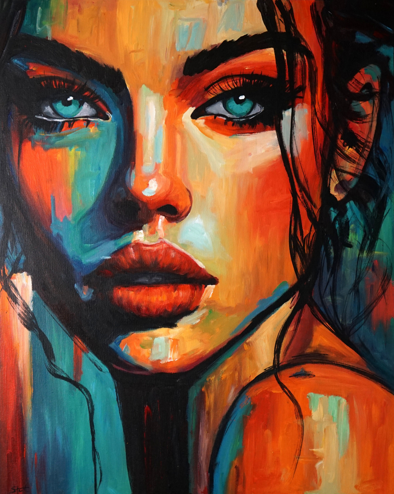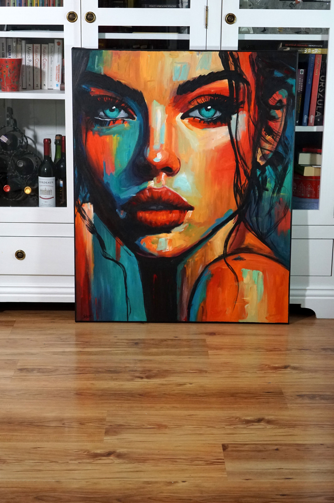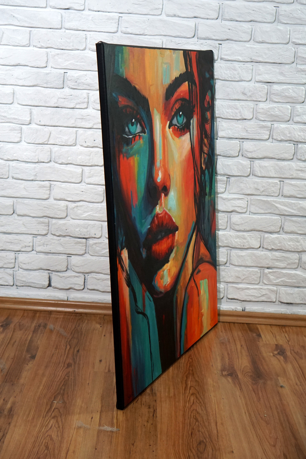 „Bunny” to intensywny, ekspresyjny portret olejny, w którym kolor przejmuje rolę emocji. Kontrast pomiędzy chłodnymi turkusami a ciepłymi pomarańczami i czerwieniami buduje napięcie oraz głębię spojrzenia. Twarz została ujęta blisko, niemal bez dystansu, co wzmacnia wrażenie bezpośredniego kontaktu z widzem. Widoczne, dynamiczne pociągnięcia pędzla nadają obrazowi energię, a jednocześnie zachowują spójność formy. To praca, która dobrze odnajdzie się w nowoczesnych, loftowych wnętrzach, wnosząc do przestrzeni wyrazisty akcent i silny ładunek emocjonalny.