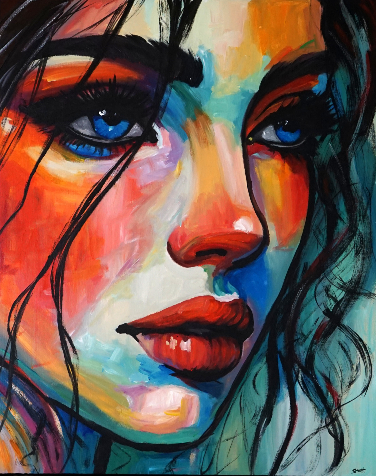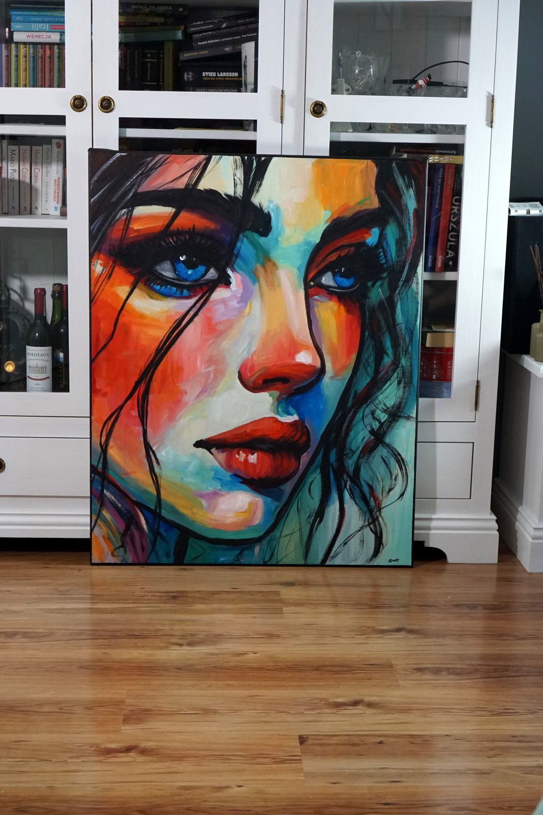 „Eyes in Blue” to ekspresyjny portret olejny, w którym centralną rolę odgrywa intensywne spojrzenie. Nasycone błękity oczu kontrastują z ciepłymi czerwieniami i pomarańczami twarzy, tworząc silne napięcie kolorystyczne i emocjonalne. Swobodne, dynamiczne pociągnięcia pędzla oraz wyraźne, czarne linie budują rytm kompozycji i podkreślają jej nowoczesny charakter. Obraz przyciąga uwagę i długo ją zatrzymuje, wprowadzając do wnętrza energię, głębię i wyrazisty akcent artystyczny — szczególnie dobrze odnajdzie się w przestrzeniach nowoczesnych, loftowych lub minimalistycznych.