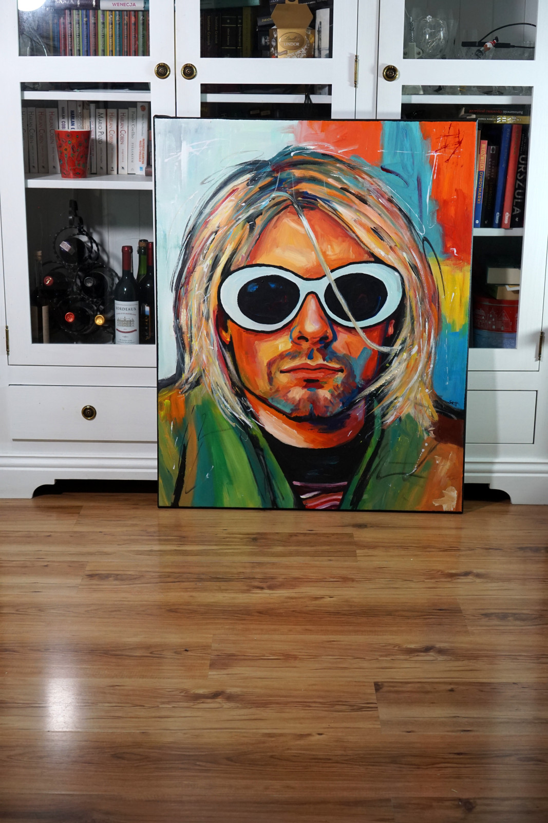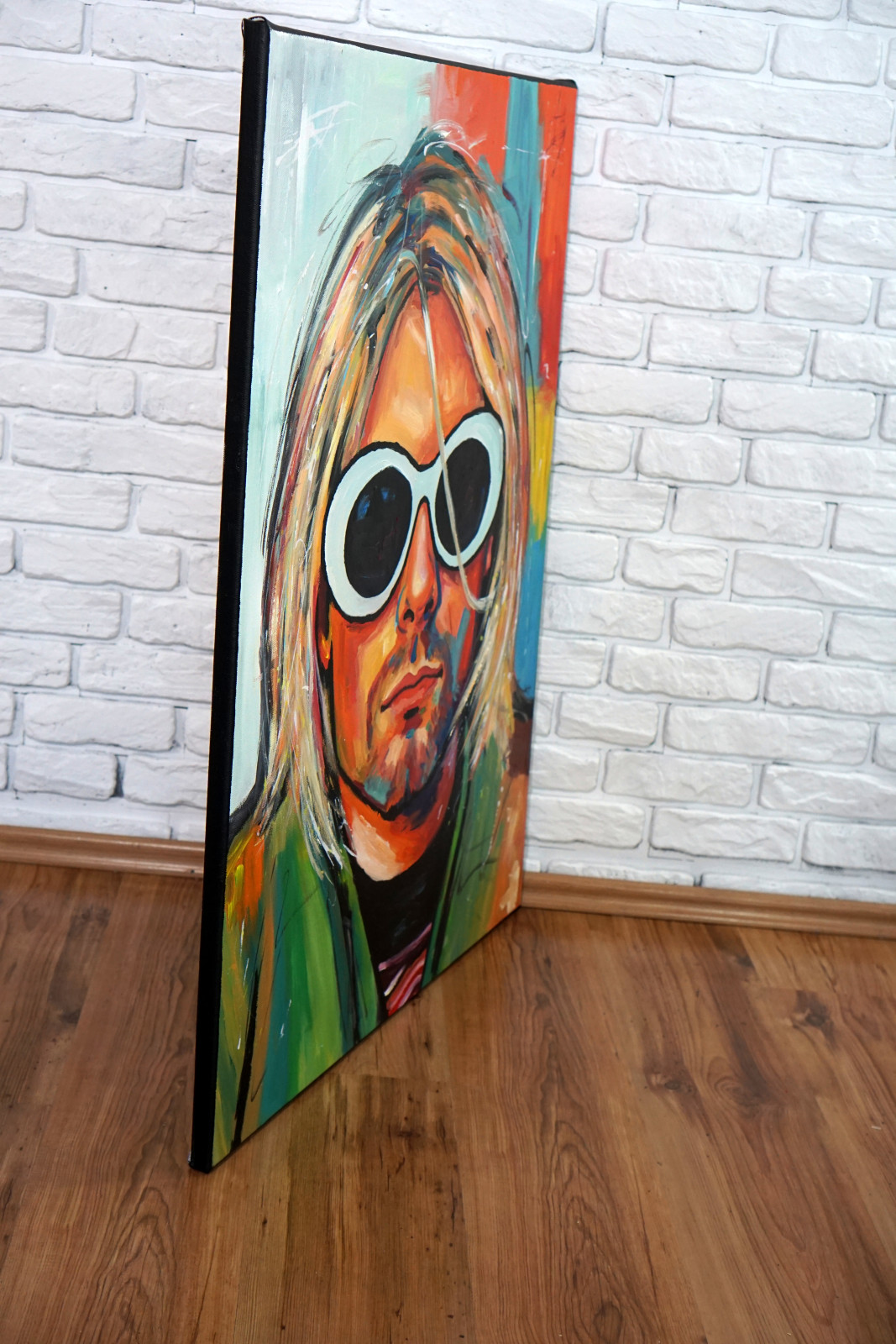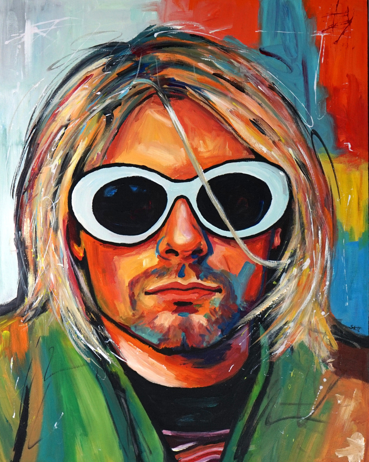 Portret „Kurt Cobain” to wyrazista, emocjonalna interpretacja ikony muzyki, ukazana nie poprzez dosłowność, lecz poprzez kolor, gest i nastrój. Charakterystyczne białe okulary stają się tu symbolem dystansu i wewnętrznego świata, a twarz — mimo uproszczeń i ekspresyjnej formy — zachowuje silną rozpoznawalność i autentyczność.