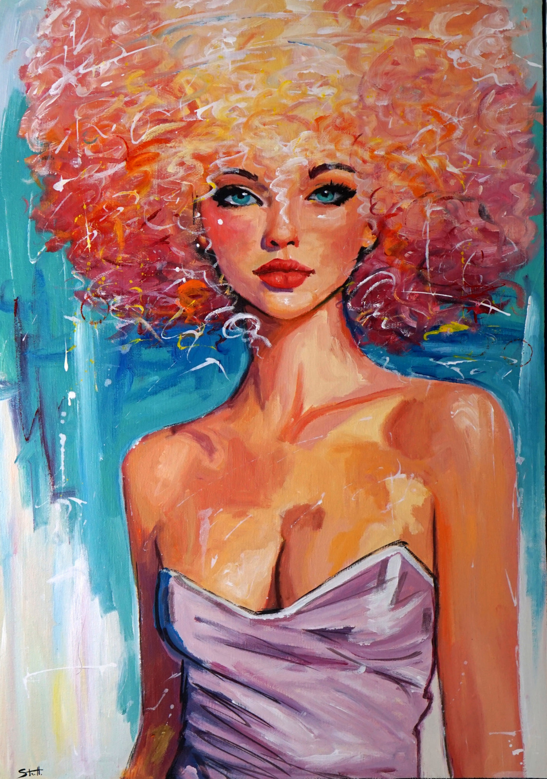 Recenzja: Peach Summer to obraz pełen letniej lekkości i subtelnej elegancji. Delikatne, brzoskwiniowe tony przeplatają się tu z błękitami, tworząc kompozycję, która od razu przywodzi na myśl ciepło promieni słońca i miękkość wakacyjnego światła. Postać kobiety, o jasnych, świetlistych włosach układających się w efektowną, ekspresyjną chmurę, emanuje wdziękiem i spokojem.