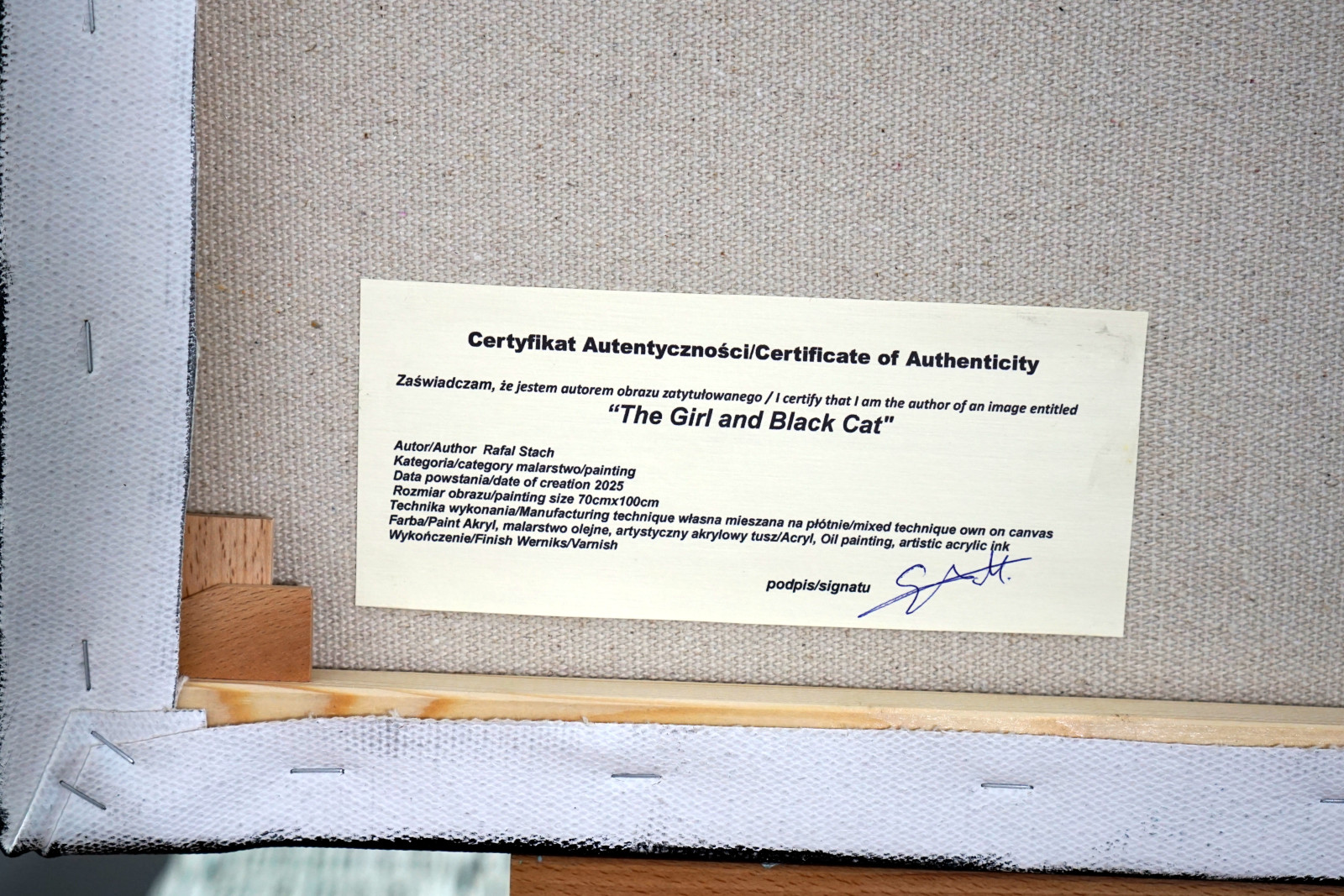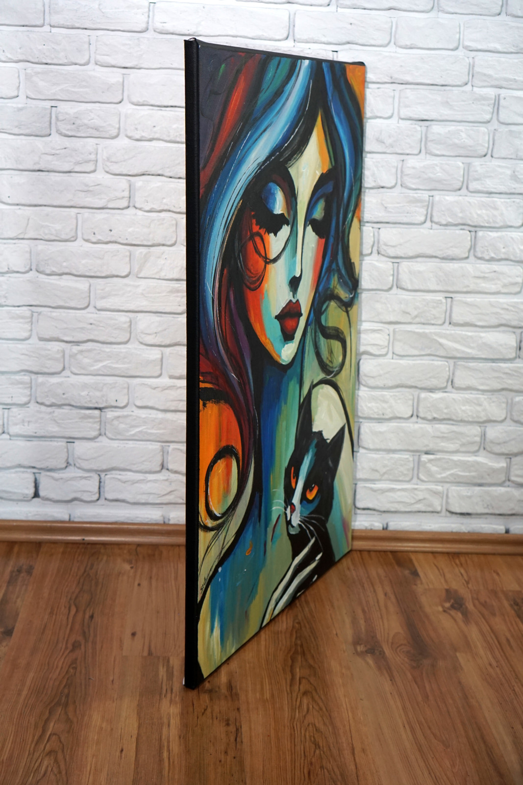 To obraz, który dobrze odnajdzie się we wnętrzach nowoczesnych, artystycznych, ale także tam, gdzie ważna jest atmosfera – spokój połączony z nutą tajemnicy. „The Girl and Black Cat” wnosi do przestrzeni nie tylko kolor i formę, ale także cichą narrację, z którą można obcować na co dzień.