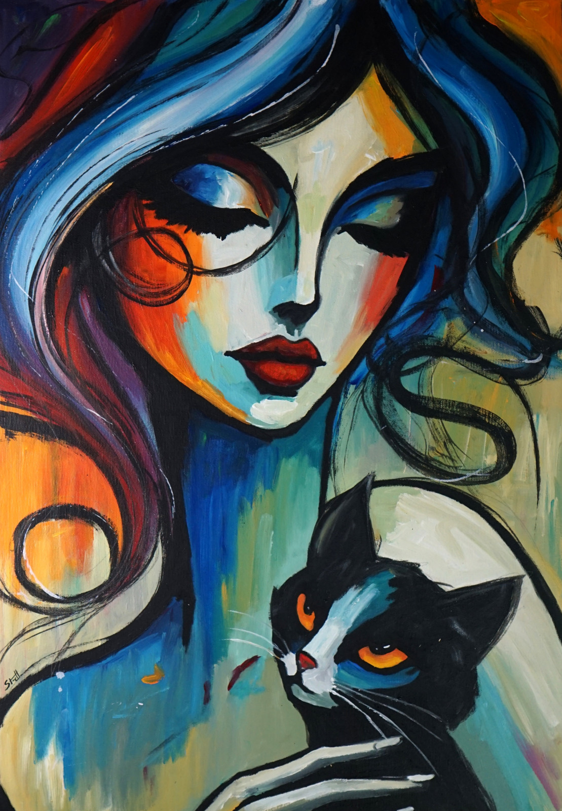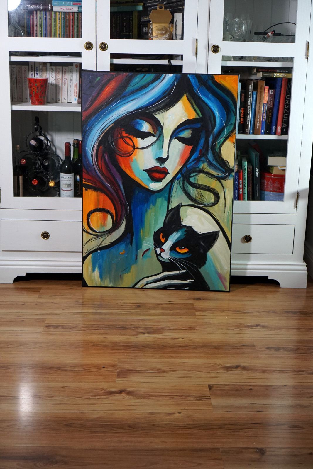 Kompozycja opiera się na płynnym prowadzeniu linii i kontrastach kolorystycznych. Chłodne błękity i zielenie twarzy oraz tła spotykają się z ciepłymi oranżami i czerwieniami, nadając całości głębię i rytm. Czarny kot, z intensywnie zaznaczonymi oczami, stanowi mocny akcent wizualny i równoważy delikatność kobiecej sylwetki. Swobodne, ekspresyjne pociągnięcia pędzla podkreślają emocjonalny charakter pracy, pozostawiając przestrzeń na indywidualną interpretację.