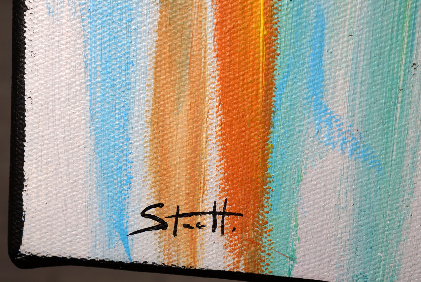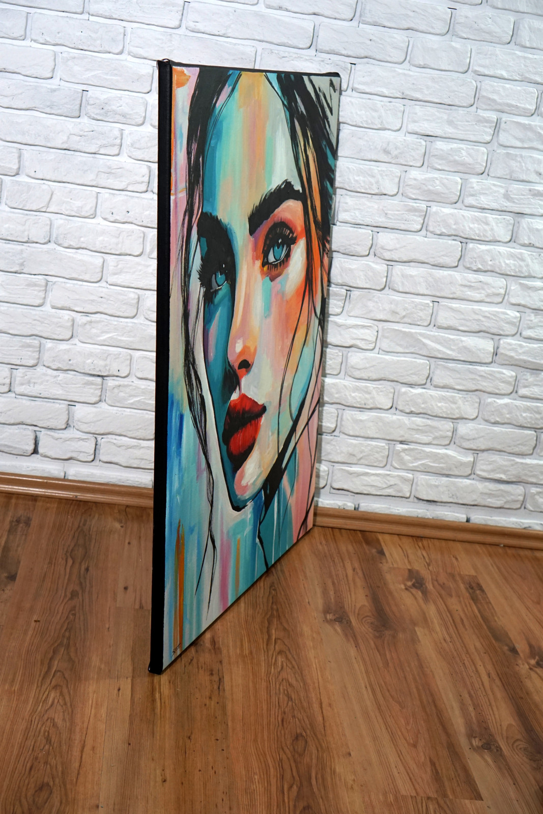 Paleta barw opiera się na miękkich przejściach błękitów, turkusów, brzoskwini i ciepłych odcieni skóry, przełamanych czarną, swobodną linią rysunku. Ten kontrast pomiędzy lekkością koloru a zdecydowanym konturem nadaje portretowi nowoczesny, lekko muralowy charakter. Widoczne pociągnięcia pędzla i warstwowość farby wprowadzają rytm oraz organiczny ruch, dzięki czemu obraz pozostaje żywy i dynamiczny.