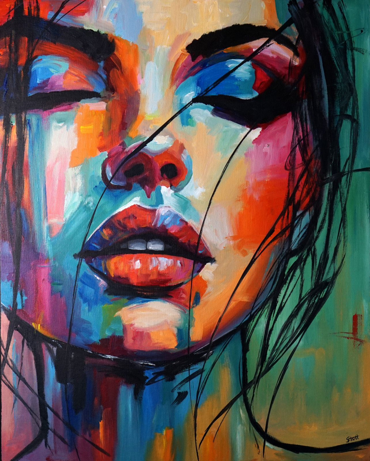 „Dream of Colors” to ekspresyjny portret, w którym kolor staje się emocją, a emocja – ruchem. Kompozycja zbudowana jest z intensywnych barw: turkusu, pomarańczu, magenty i błękitu, które tworzą pulsujący rytm, przywodzący na myśl sen pełen światła i energii. Zamknięte oczy bohaterki wprowadzają subtelny kontrast między wewnętrznym spokojem a zewnętrzną eksplozją koloru, nadając obrazowi hipnotyczną głębię.