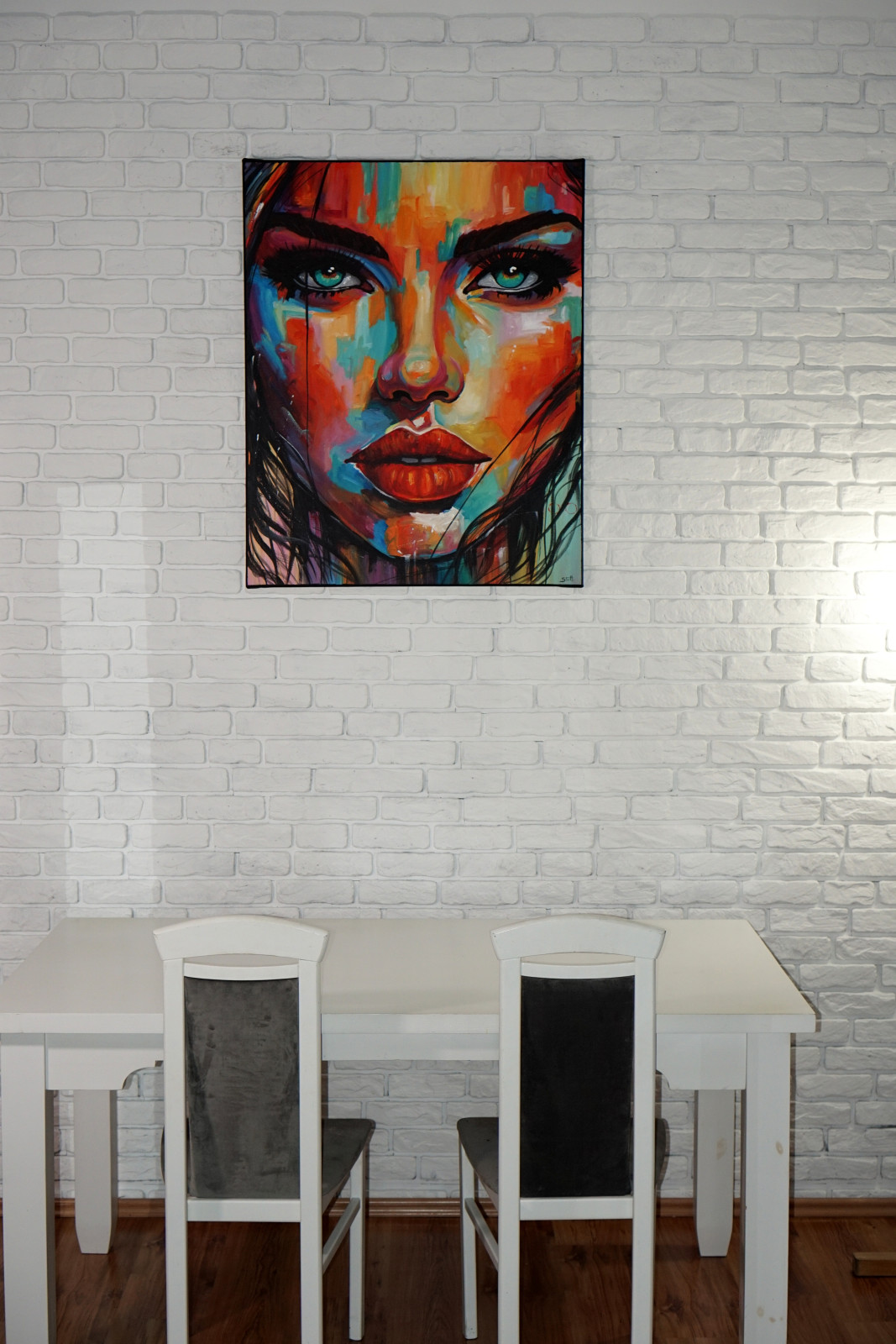 „Siła spojrzenia” to obraz, który nie tylko emanuje emocjonalną intensywnością, ale także wnosi do wnętrza aurę nowoczesnej sztuki – odważnej, pełnej kontrastów i energii.