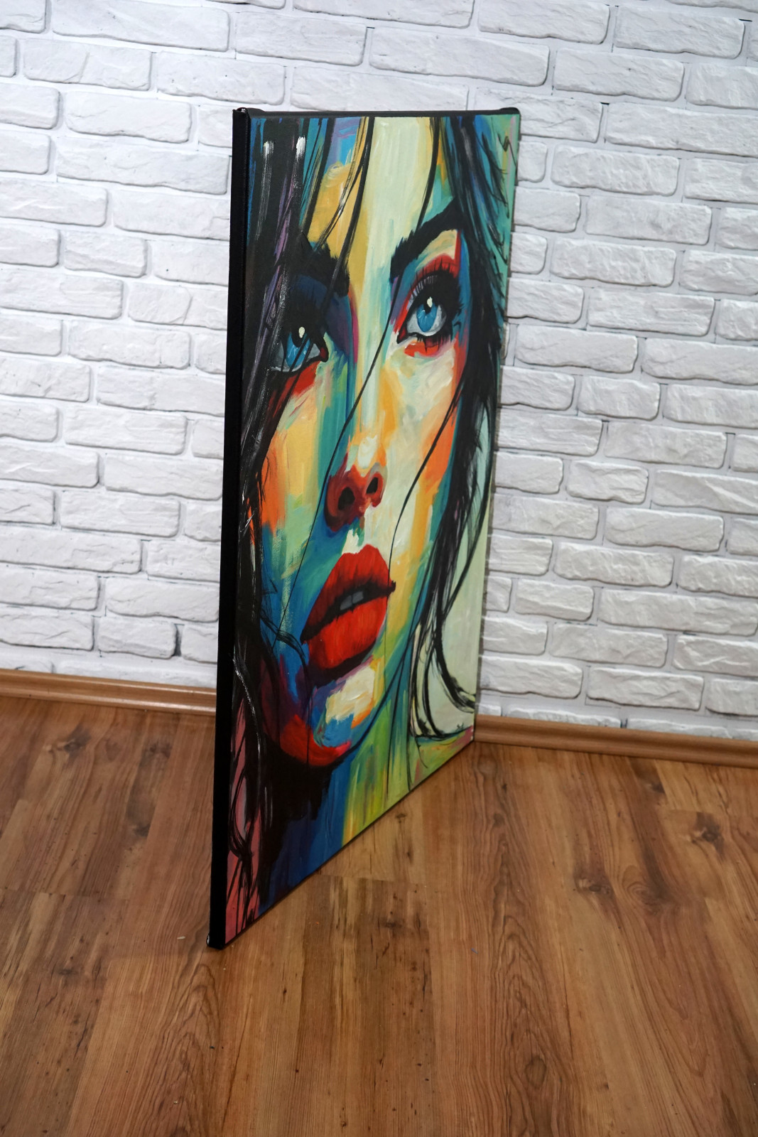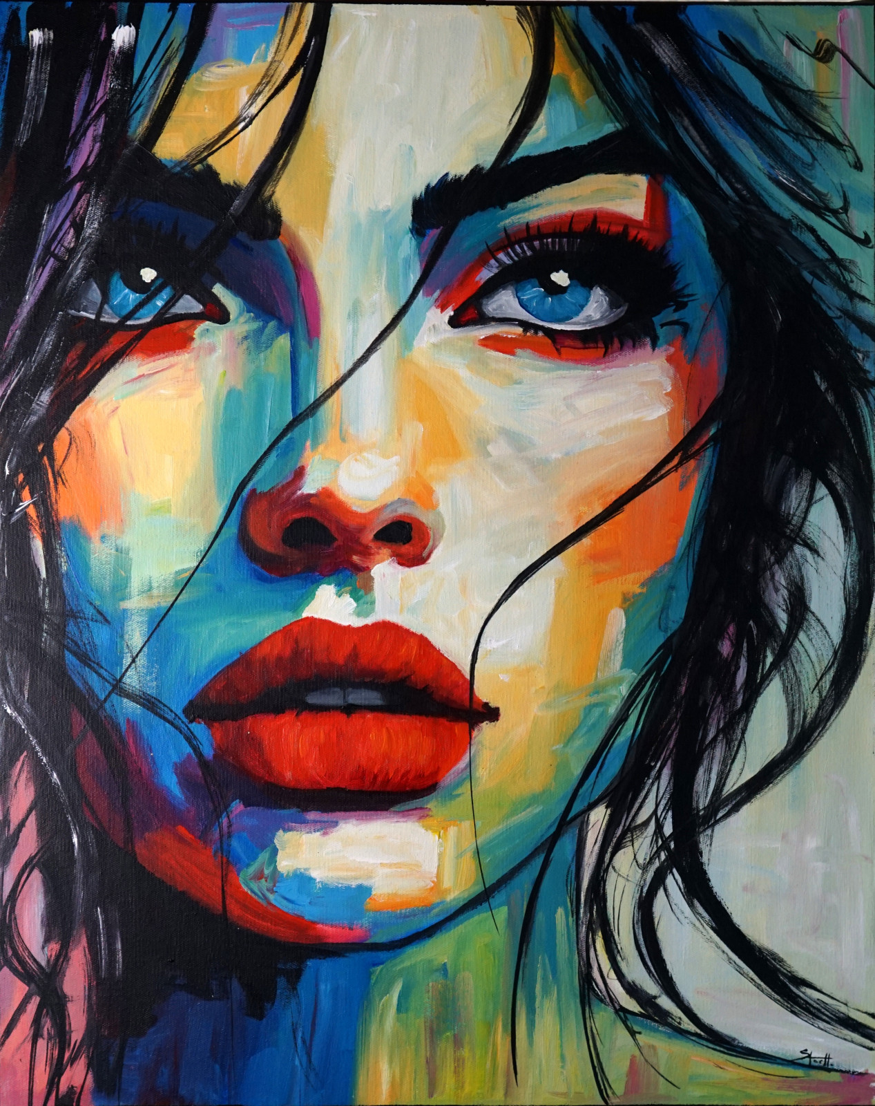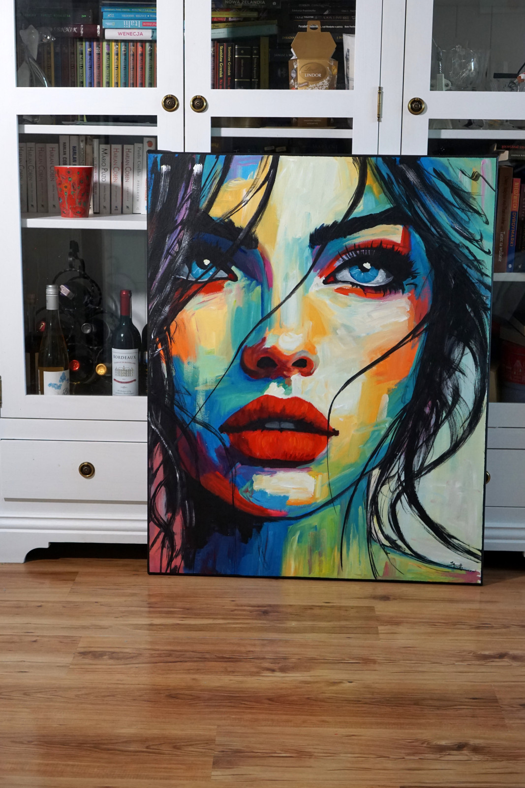 „This Moment” to portret zatrzymany w punkcie napięcia między ciszą a emocją. Intensywne spojrzenie kobiety przykuwa wzrok i nie pozwala przejść obojętnie – jakby chciała coś powiedzieć, ale decydowała się milczeć. Artysta w mistrzowski sposób łączy kontrastowe barwy: błękity, turkusy i żółcie z ogniście czerwonymi ustami, tworząc ekspresję, która jest jednocześnie silna i pełna wrażliwości.