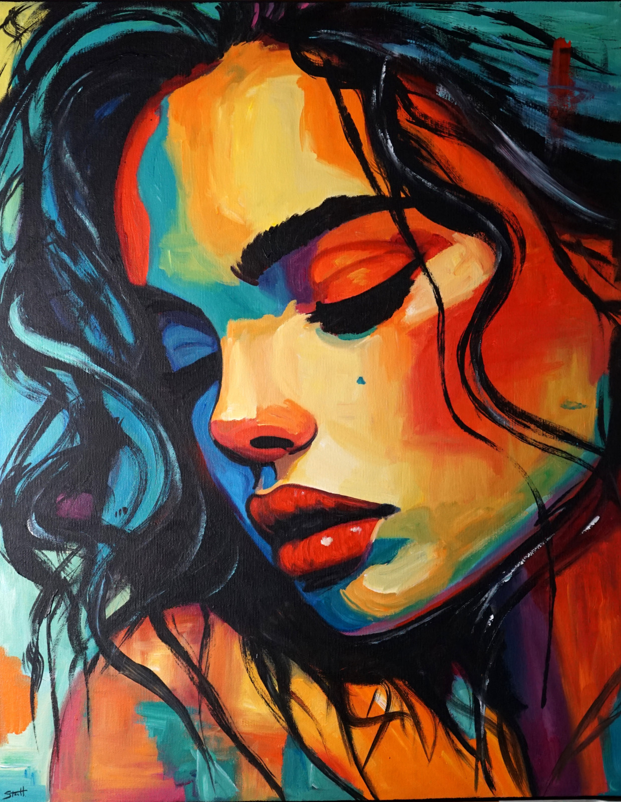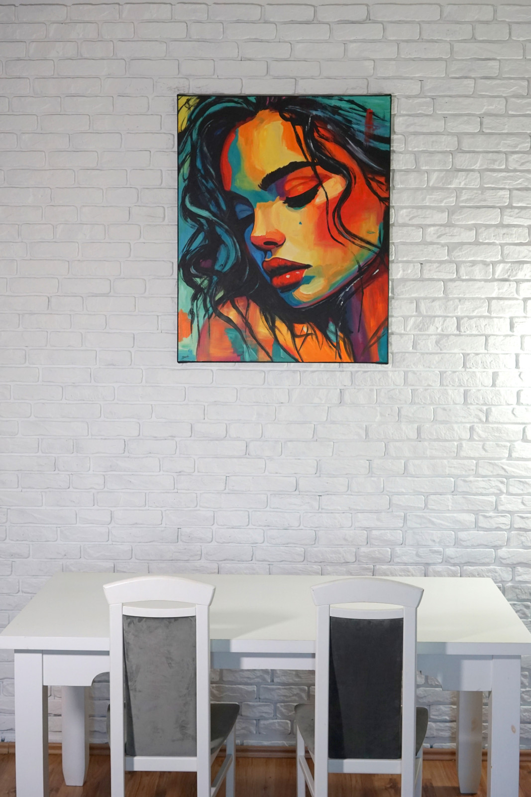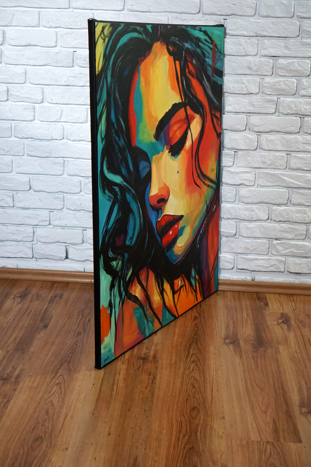 Kompozycja zachwyca subtelnością gestu i mocą koloru — to obraz, który zatrzymuje uwagę, emanując melancholijnym spokojem po burzliwym dniu. „What a Day” wprowadza do wnętrza aurę wyciszenia i introspekcji, będąc jednocześnie pełnym energii symbolem kobiecej siły i wrażliwości.