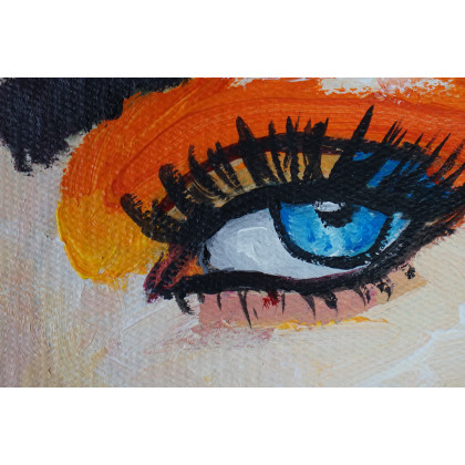 Obraz wykonany techniką olejną zachwyca intensywnością barw — dominujące oranże, czerwienie i żółcie kontrastują z chłodnymi akcentami błękitu i szarości. Artysta wykorzystał ekspresyjne pociągnięcia pędzla oraz dynamiczne, czarne linie podkreślające kontury postaci i detale fryzury. Warstwowe nakładanie farby oraz delikatne rozbryzgi dodają kompozycji lekkości i artystycznej swobody.