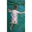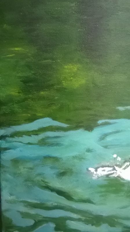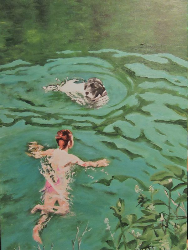 Obraz pod tytułem Pierwsza kąpiel malowany farbami akrylowymi , boki malowane według tematu na płótnie ,werniksowany .Motywacja do namalowania tej scenki był zwierzęcy instynkt .Jest to pierwszy kontakt z woda młodego psa i automatycznie włączył się instynkt ,pies pływał bez leków przed woda